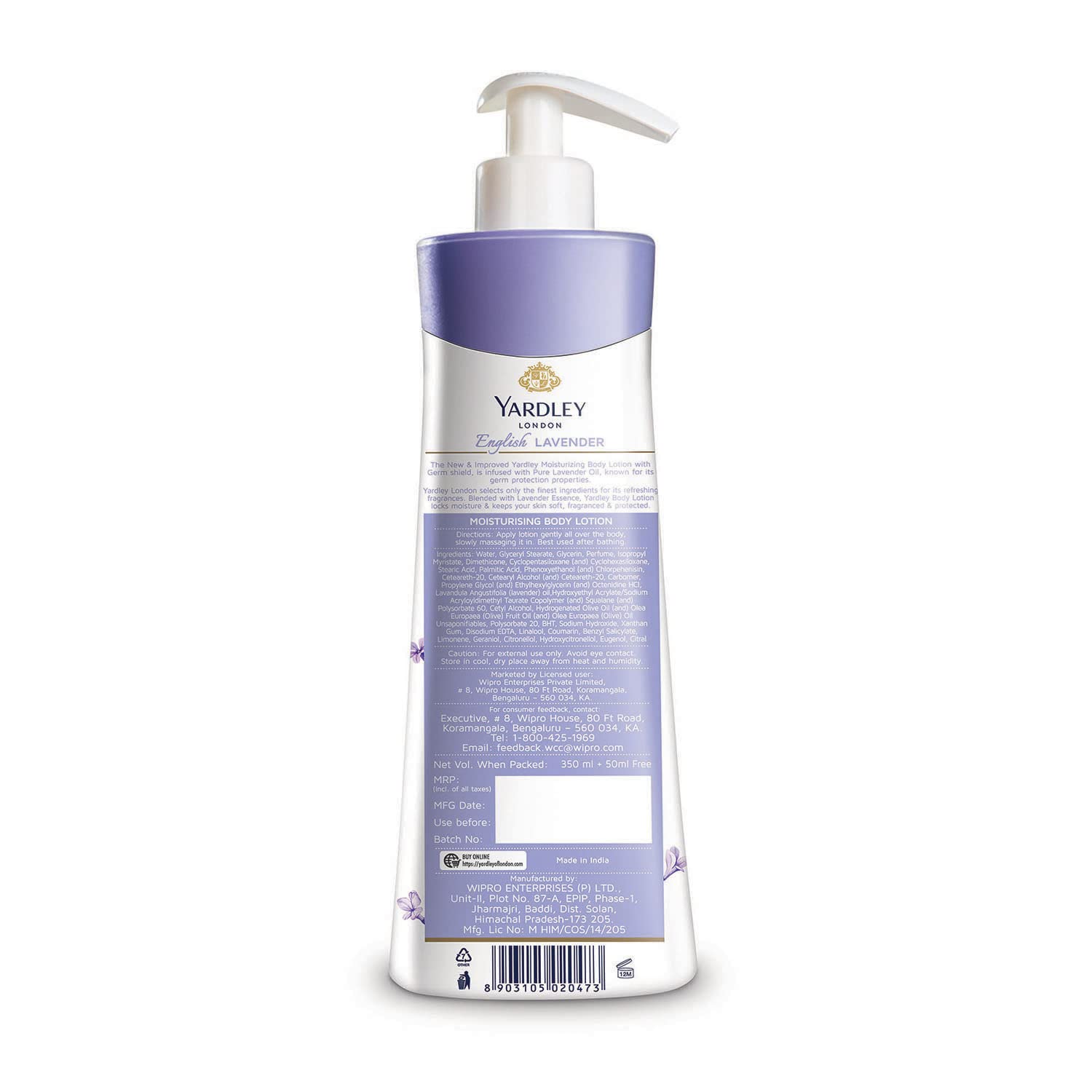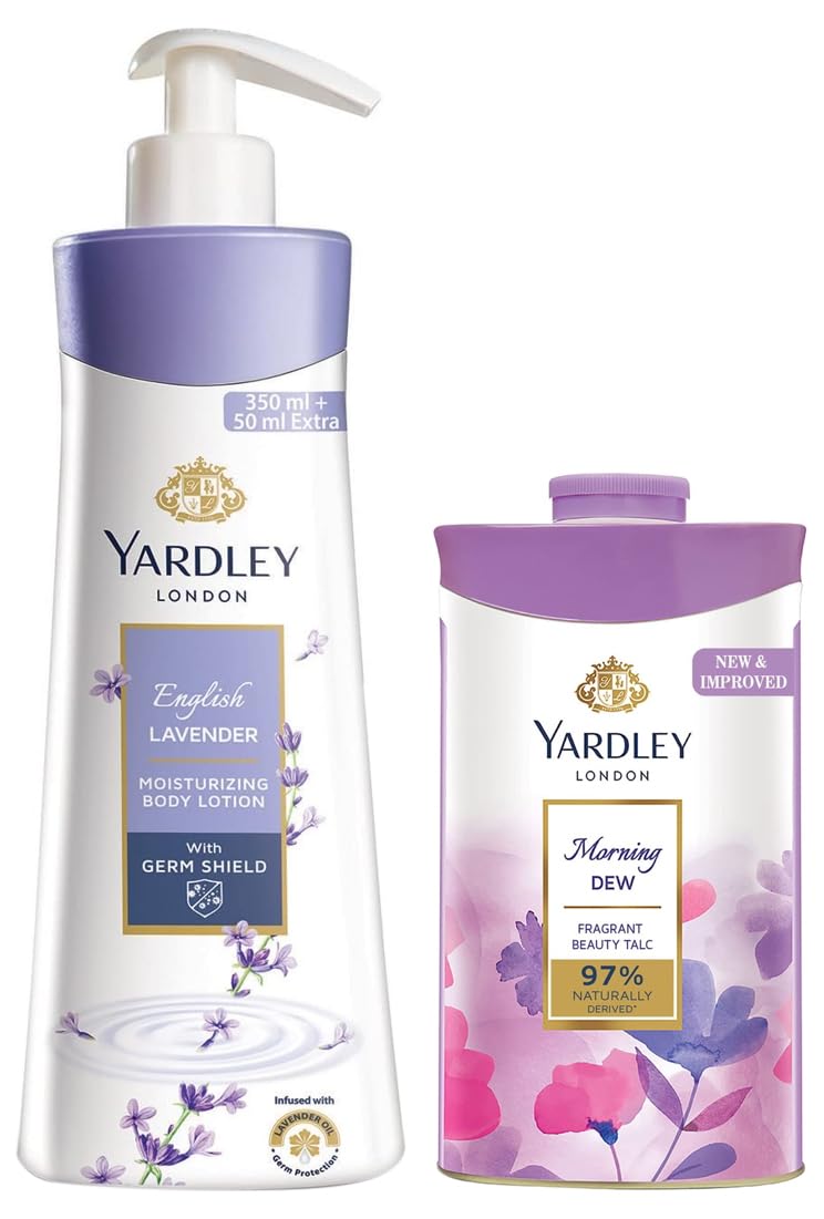 Yardley English Lavender Hand & Body Lotion for Women 350ml + 50ml (400ml)Yardley moisturising body lotion infused with flower power of natural floral extracts contains the goodness of 10 active floral cells in every 100 ml for beautifully soft and glowing skin.Yardley London Morning Dew Perfumed Talc for Women 250g powderThis Morning Dew fragrance will pacify your skin making sure you have an aromatic day. Fresh and dewy the Morning Dew scent awakens the senses leaving you feeling refreshed to take on the new day with vibrant and musky fragrances of white flowers.