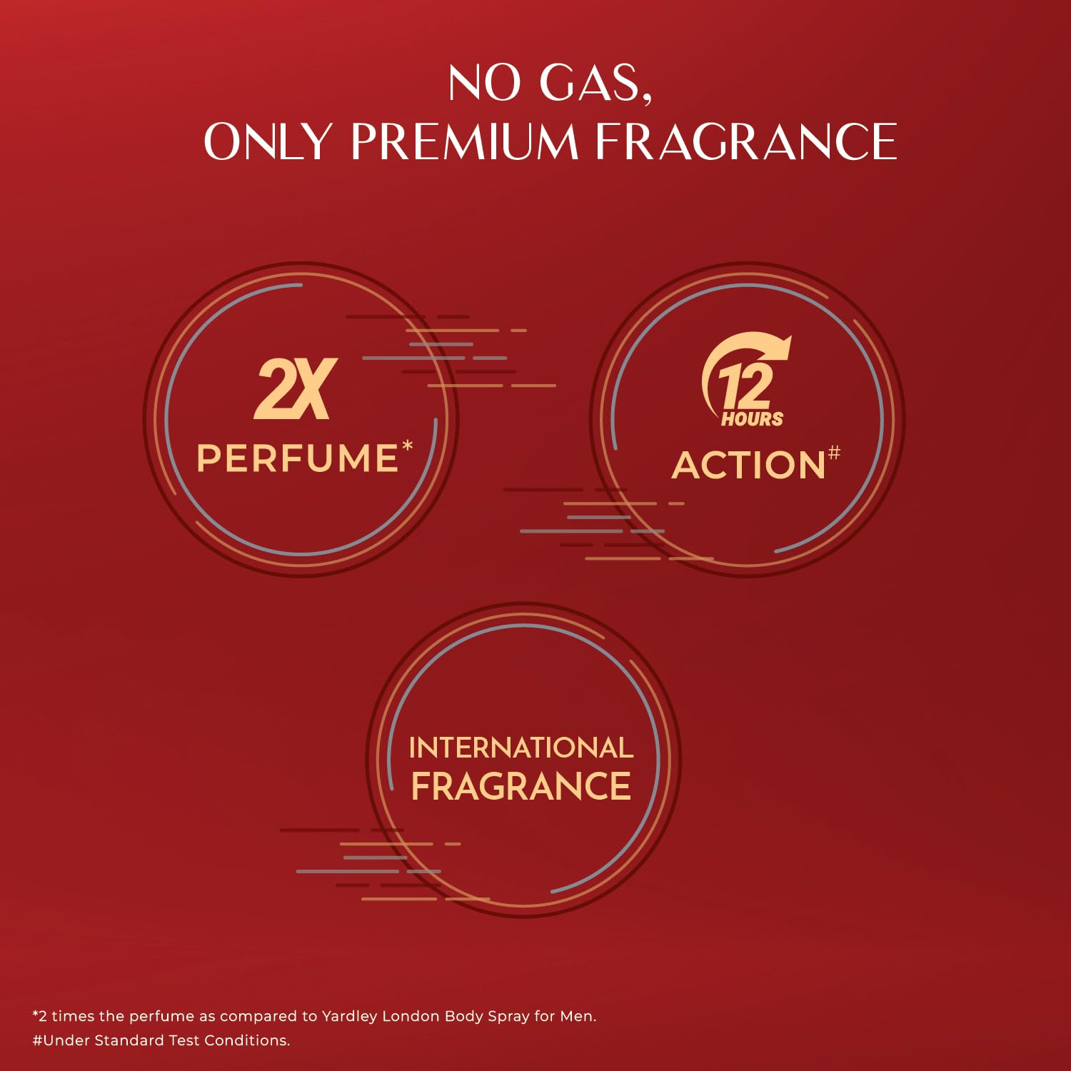 0% Gas 2X Perfume* 12 Hours Action# *2 times the perfume as compared to Yardley London Body Spray for Men. #Under Standard Test Conditions.