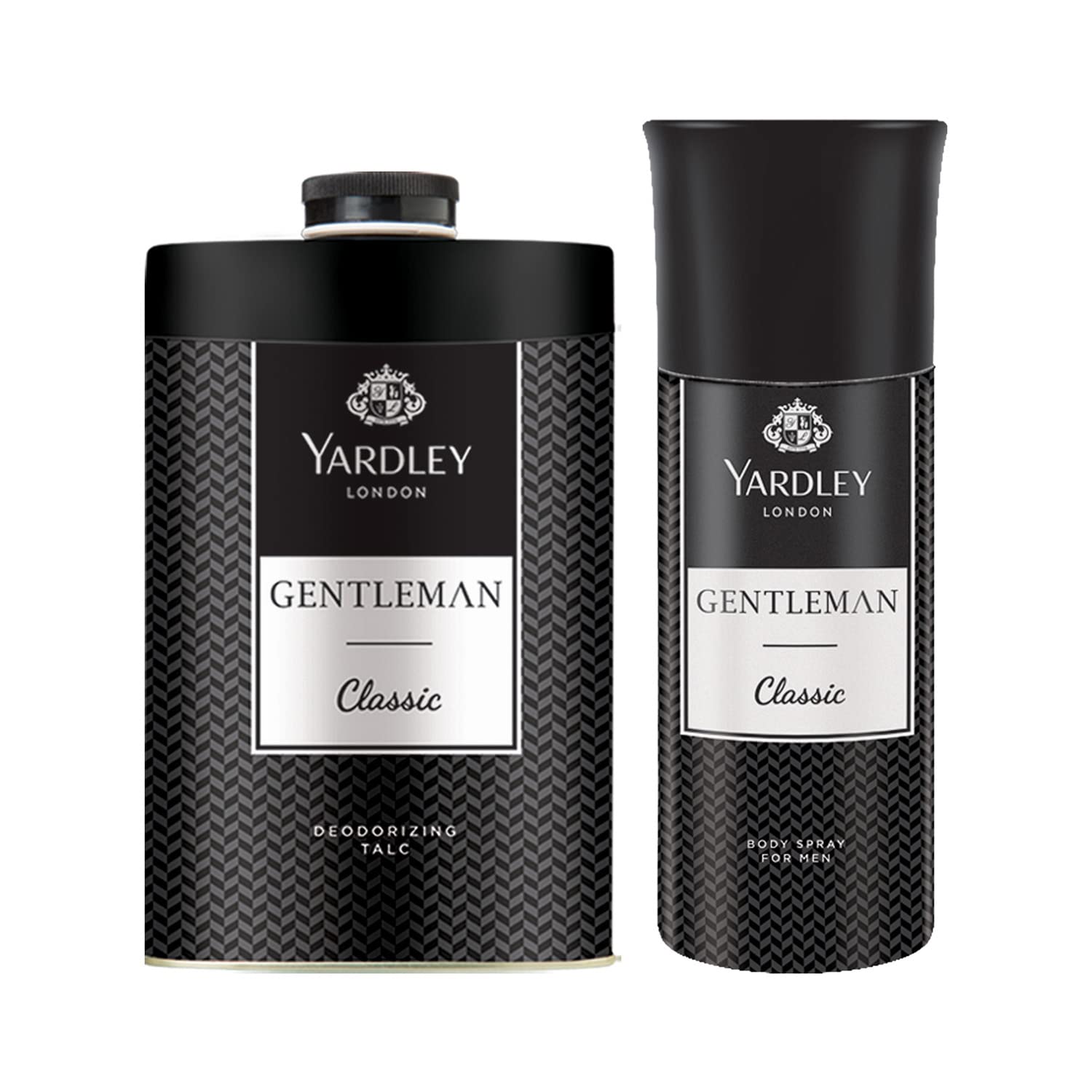 Yardley London Gentleman Classic Deo Body Spray for Men 150mlA gentleman is distinguished by many virtues; one of them is his scent. A gentleman always smells good no matter what. Yardley London Gentleman Classic Deodorant reminds one of the classic gentlemen of the Victorian era. The fragrance of this deodorant is modern yet classical. With a hint of fresh citrus a whiff of black pepper and the earthiness of cardamom this fragrance is all about being humble and rooted. The special smell is also replete with a spicy blend of many charming aromas. It has a soft touch of floral notes a woody feel of sandalwood musk and amber along with a sweet hint of white chocolate. This heavenly fragrance is full of the love of the earth with a subtle blend of rich and luxurious aromas that all point towards the royal gentlemen. This is one deodorant that will not make your lady swoon and fall for you but will ignite in her heart a sense of deep respect and liking for your fetching personality.Yardley London Gentleman Talcum Powder 250gYardley luxury perfumed talc leaves your skin feeling soft and fragrant all day.