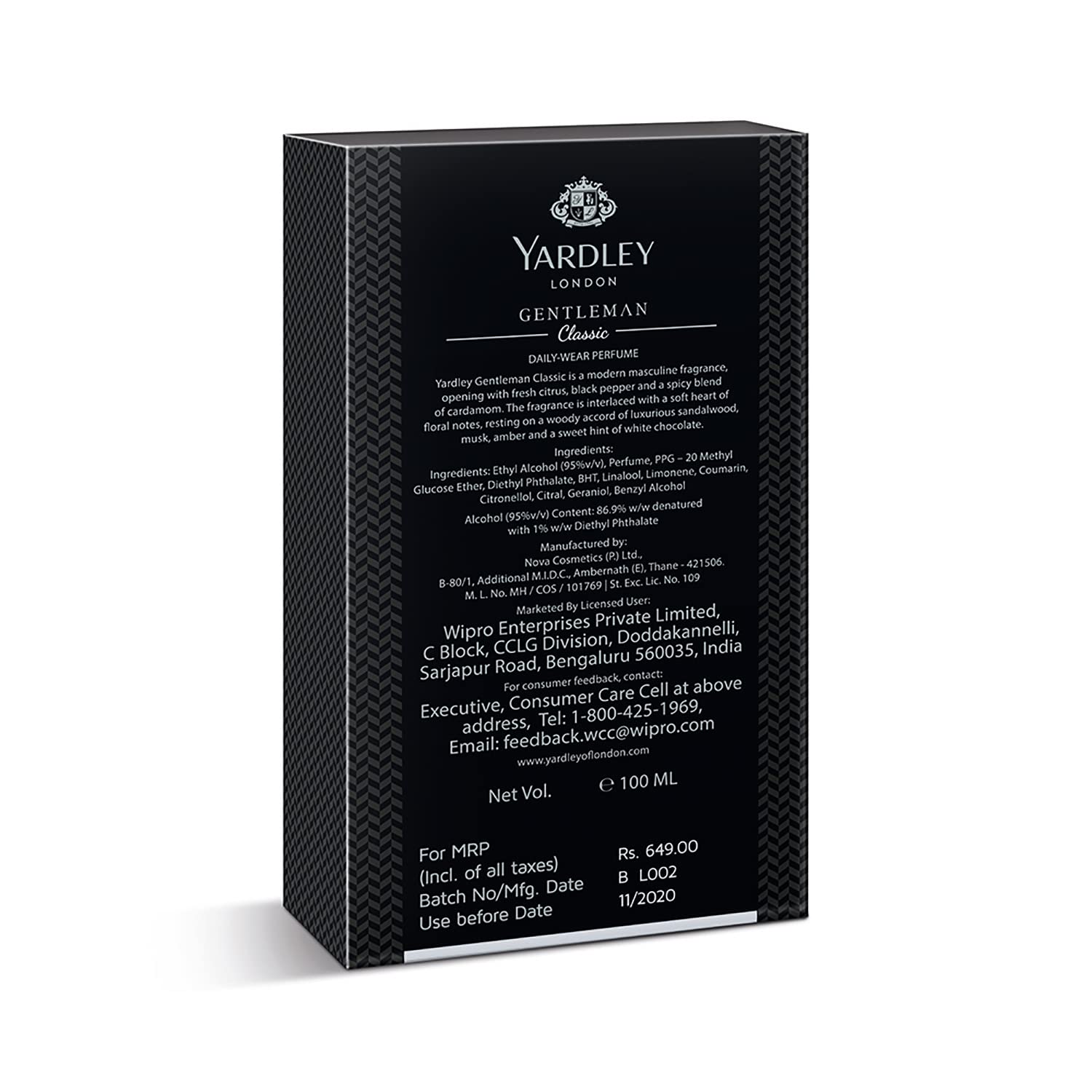 Embrace sophistication with Yardley London Gentleman's Classic Daily Wear Perfume. Designed for the refined man who appreciates life's finer things. Woody fougère notes leave a lasting captivating impression. Fresh citrus black pepper and cardamom create a vibrant allure. Soft floral notes add refinement while sandalwood musk amber and a hint of white chocolate bring sophistication. This perfect blend of Englishness luxury and quality delivers a natural fragrance to love. Yardley Gentleman Classic daily wear perfume for men embodies the essence of a true Gentleman setting you apart. Experience superior perfume power staying fresh and confident all day with Yardley London. High retention ensures that the captivating scent of this body perfume accompanies you wherever you go. Indulge in the aroma of a masculine fragrance with our premium packaging complementing the classiness of a true Gentleman. Elevate your style and personal hygiene. Trust Yardley's commitment to excellence and embrace the confidence of a true Gentleman.