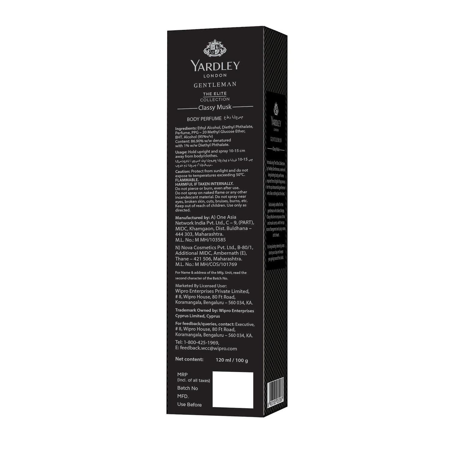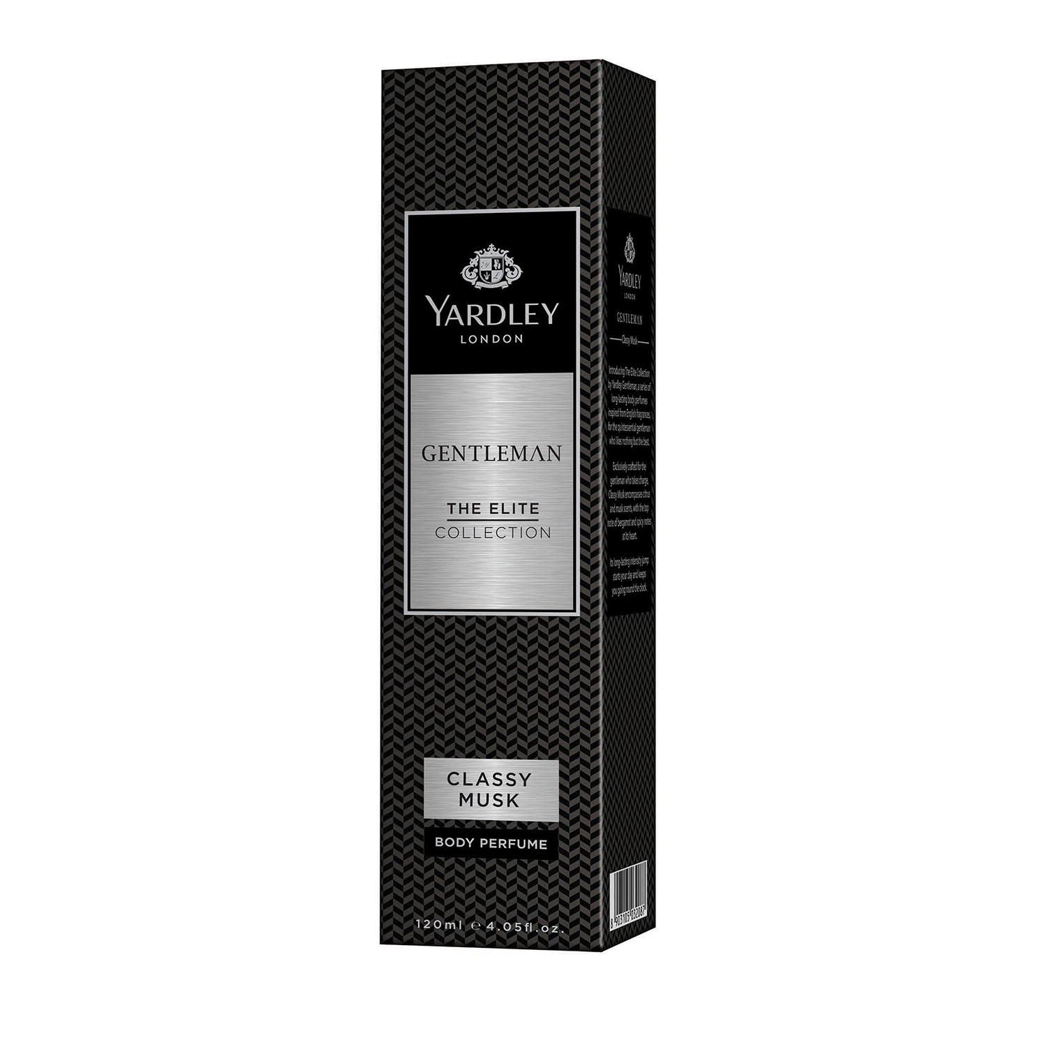 Introducing Yardley London Gentleman Classy Musk No Gas Deodorant Body Spray Perfume an embodiment of class and sophistication. Designed exclusively for the modern gentleman who exudes confidence and takes charge this perfume redefines elite fragrance with more perfume made from exotic ingredients and remarkable retention. Classy Musk body perfume for men offers a captivating blend of citrus and musk with bergamot top notes and a heart of spicy accents. This unique composition creates an aura of distinction that perfectly complements the accomplished man's persona. The Elite Collection by Yardley Gentleman introduces a series of long-lasting perfumes inspired by English fragrances tailored for those who demand nothing but the best. Immerse yourself in the novel masculine aromas infused with warm woody base notes that leave a lasting impression long after you've left the room. This fragrance not only uplifts your mood but also instils confidence keeping you active and invigorated throughout the day.Yardley London with a legacy spanning over 250 years stands as England's most prestigious purveyor of quality perfumes and soaps. The brand's essence is a harmonious blend of Englishness luxury quality and natural fragrances making it the trusted choice of the quintessential gentleman.