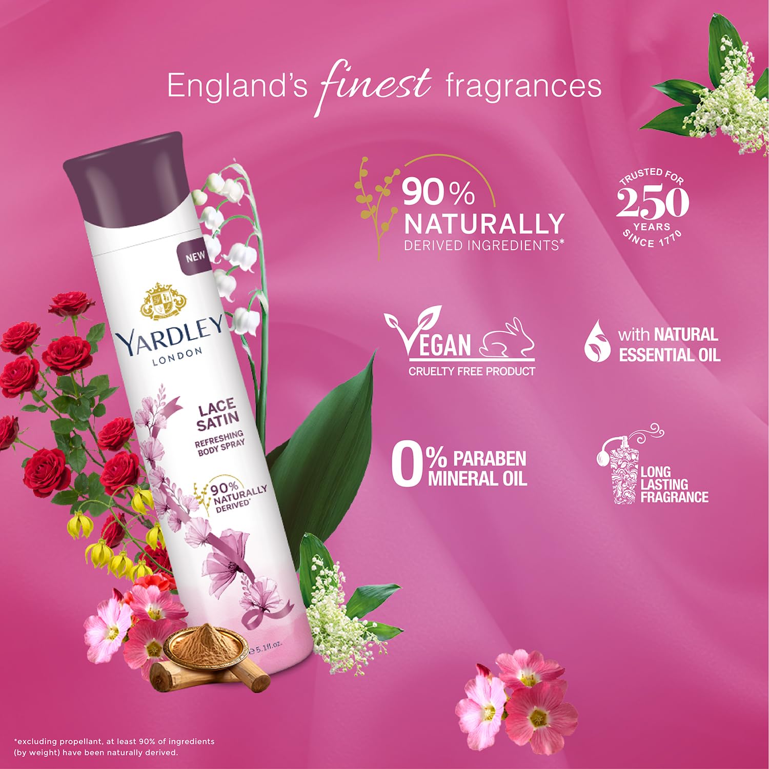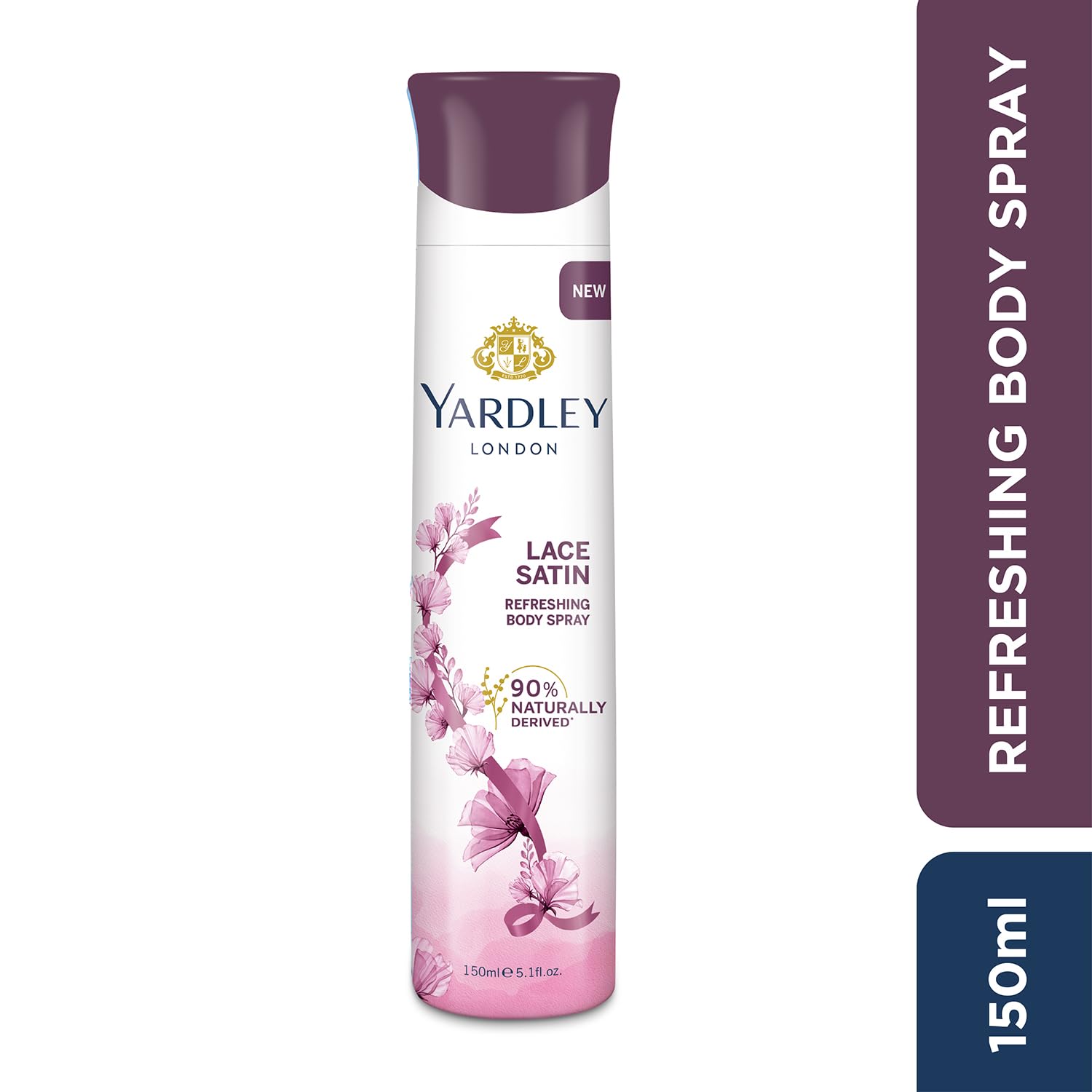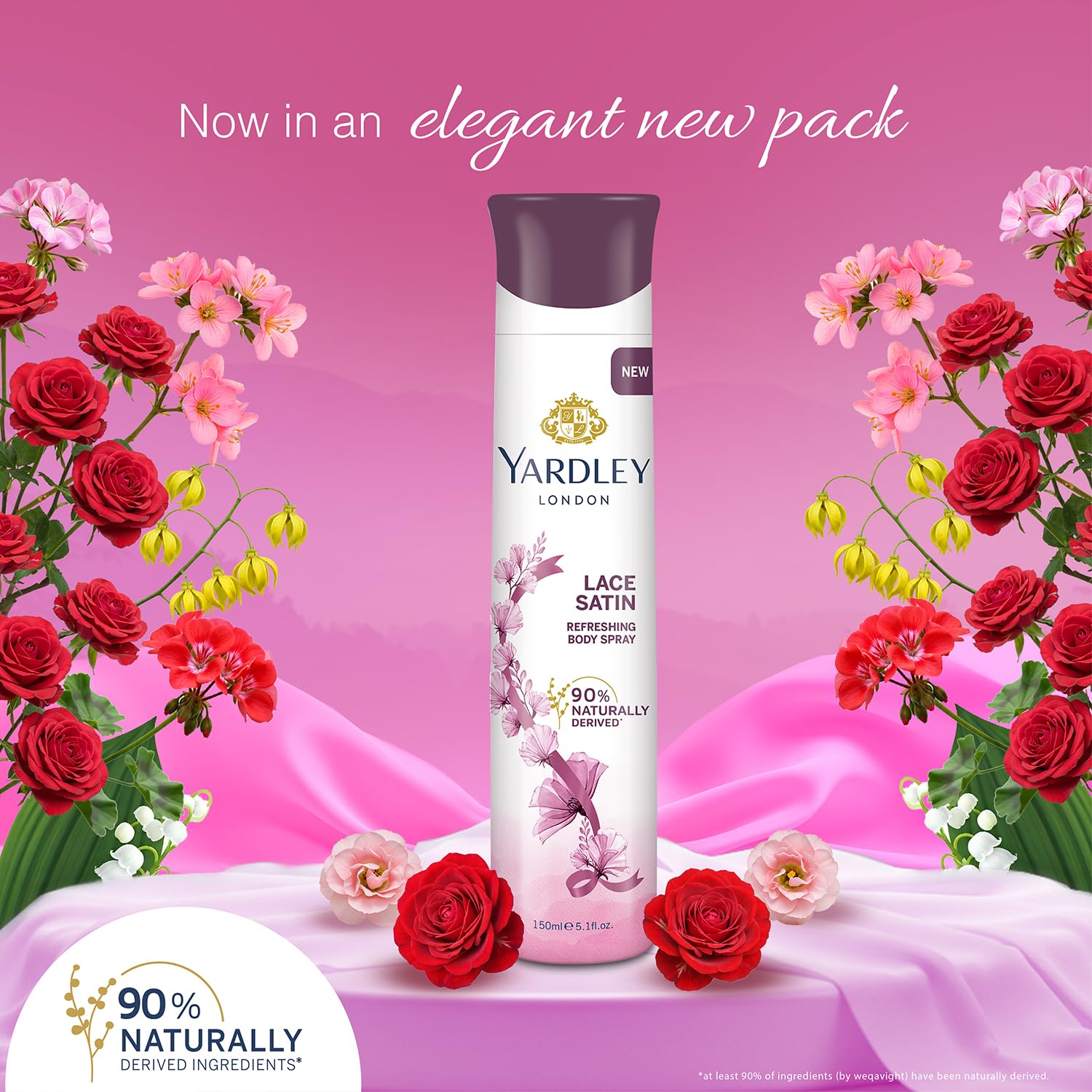 Discover the captivating world of Yardley London's Lace Satin Perfumed Deodorant Body Spray for Women. Envelop yourself in an exquisite fragrance of this body deodorant designed to enhance your natural allure. Lace Satin Perfumed Deo is more than just a scent; it's a touch of elegance and femininity that effortlessly accompanies you throughout your day. As you spritz Lace Satin its delicate notes caress your skin wrapping you in an irresistible charm that leaves a lasting impression. This fragrance is the embodiment of femininity designed to accentuate your innate sensuality and make you feel confident and alluring. Whether heading to a special occasion or simply embracing the beauty of everyday life Lace Satin Perfumed Deo is the perfect companion.Lace Satin Perfumed Deo is a part of Yardley's Fusion Fragrances a contemporary range crafted from a bouquet of fresh flowers in the English countryside. Each spray carries the essence of blooming florals giving you a sense of nature's beauty with every application. This fusion of scents adds a unique and modern twist to the classic floral fragrances Yardley is renowned for.The House of Yardley has a legacy that spans over 250 years specialising in classic and premium floral fragrances that exude English luxury. Indulge in the freshness of Yardley London's floral fragrances which transport you straight from the fields of the English countryside. With a commitment to quality authenticity and natural fragrances Yardley London stands as the quintessential English fragrance offering you the finest in premium perfumes and ancillary body products.