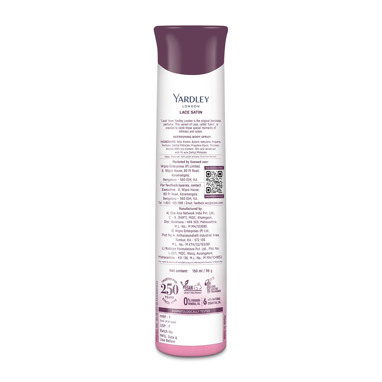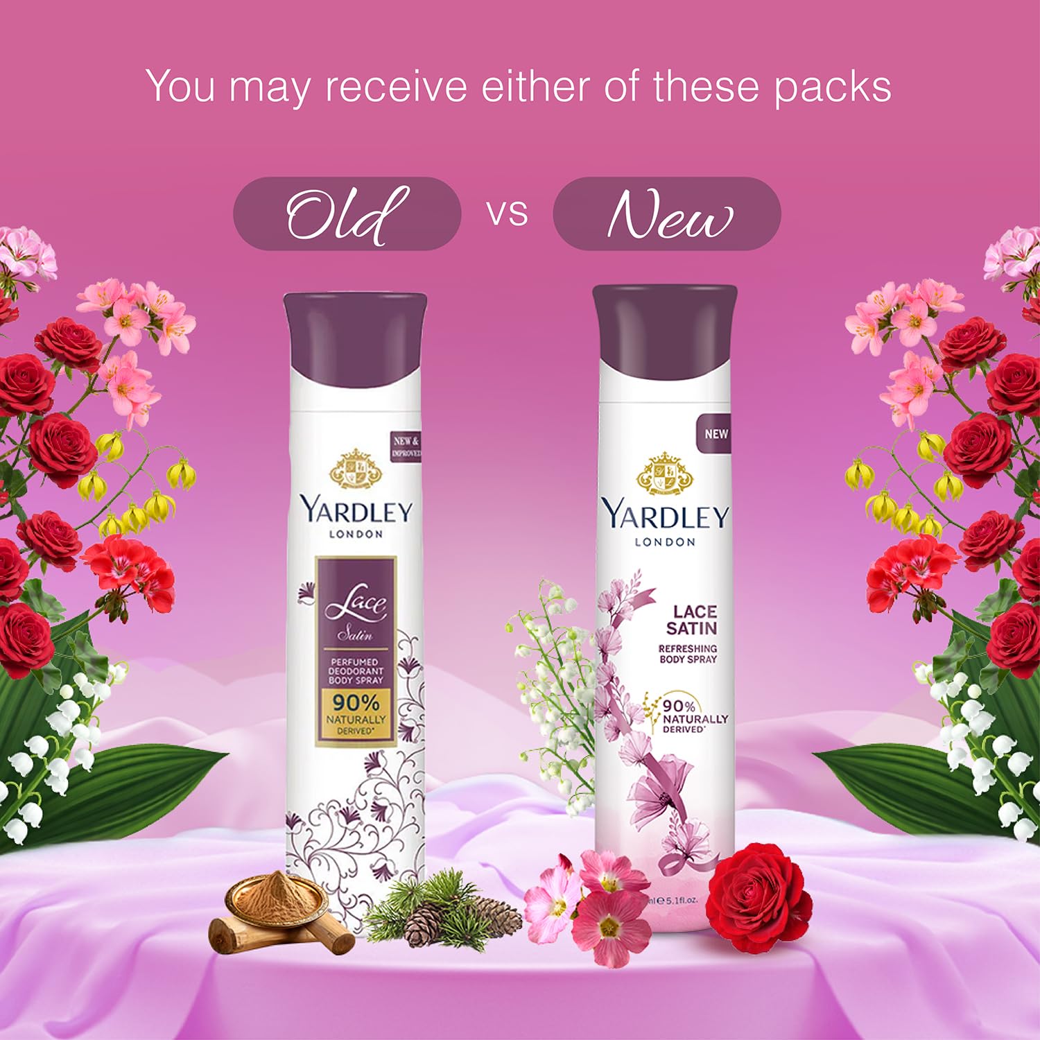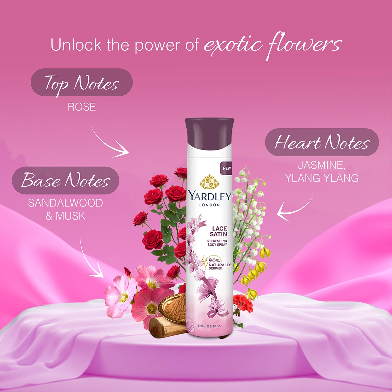 Discover the captivating world of Yardley London's Lace Satin Perfumed Deodorant Body Spray for Women. Envelop yourself in an exquisite fragrance of this body deodorant designed to enhance your natural allure. Lace Satin Perfumed Deo is more than just a scent; it's a touch of elegance and femininity that effortlessly accompanies you throughout your day. As you spritz Lace Satin its delicate notes caress your skin wrapping you in an irresistible charm that leaves a lasting impression. This fragrance is the embodiment of femininity designed to accentuate your innate sensuality and make you feel confident and alluring. Whether heading to a special occasion or simply embracing the beauty of everyday life Lace Satin Perfumed Deo is the perfect companion.Lace Satin Perfumed Deo is a part of Yardley's Fusion Fragrances a contemporary range crafted from a bouquet of fresh flowers in the English countryside. Each spray carries the essence of blooming florals giving you a sense of nature's beauty with every application. This fusion of scents adds a unique and modern twist to the classic floral fragrances Yardley is renowned for.The House of Yardley has a legacy that spans over 250 years specialising in classic and premium floral fragrances that exude English luxury. Indulge in the freshness of Yardley London's floral fragrances which transport you straight from the fields of the English countryside. With a commitment to quality authenticity and natural fragrances Yardley London stands as the quintessential English fragrance offering you the finest in premium perfumes and ancillary body products.