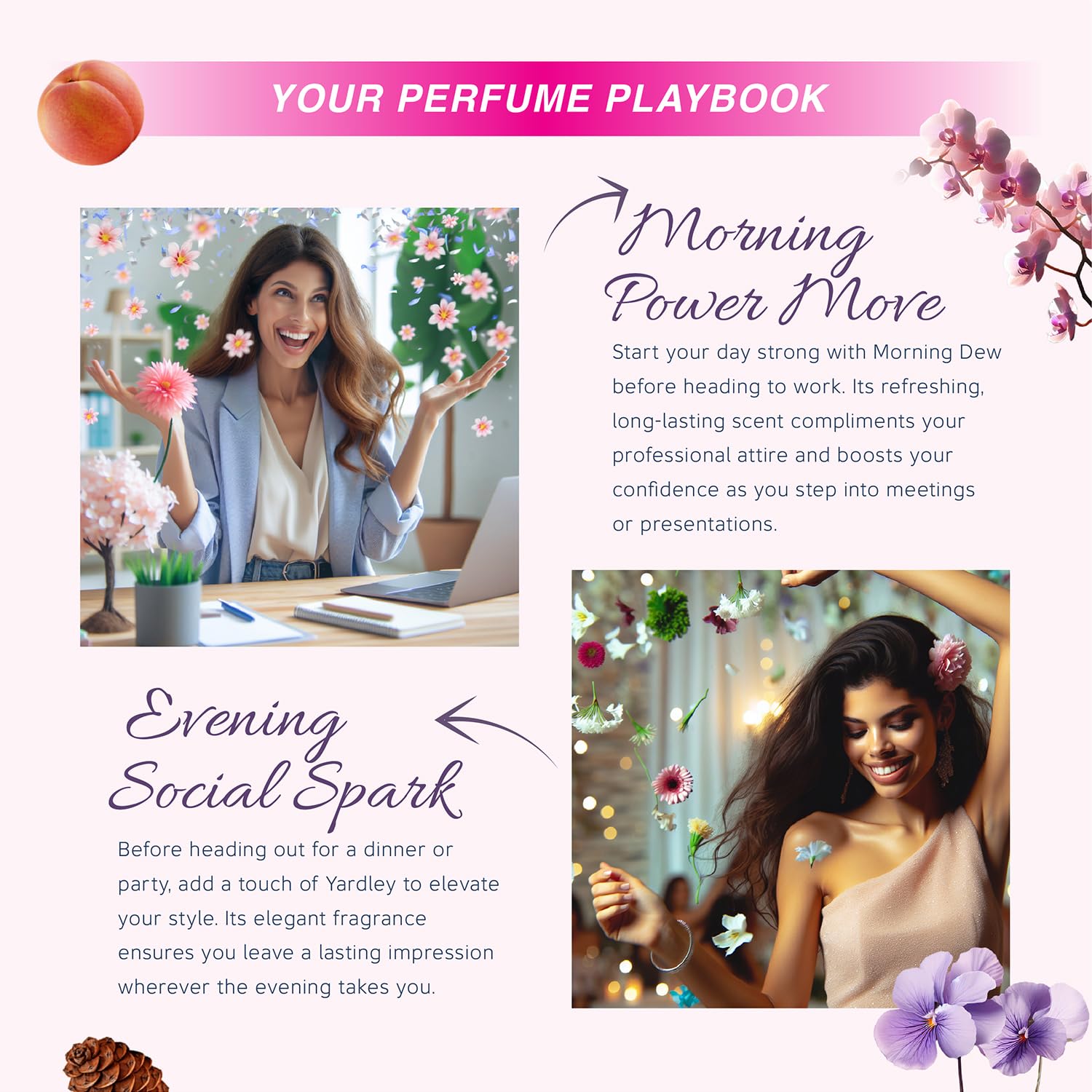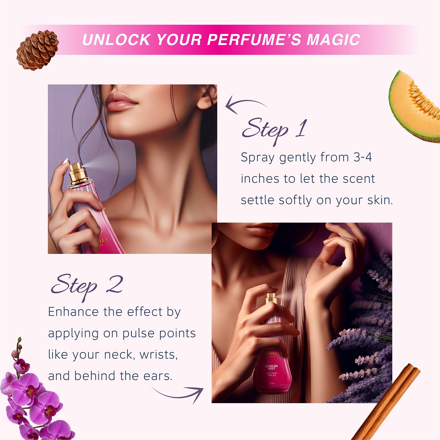 • Fruity Floral Fantasy: Effervescent Melon Peach and Orchidsoftness and lasting Cinnamon woodiness in Yardley London Mist daily wear perfume knit a dreamy aura