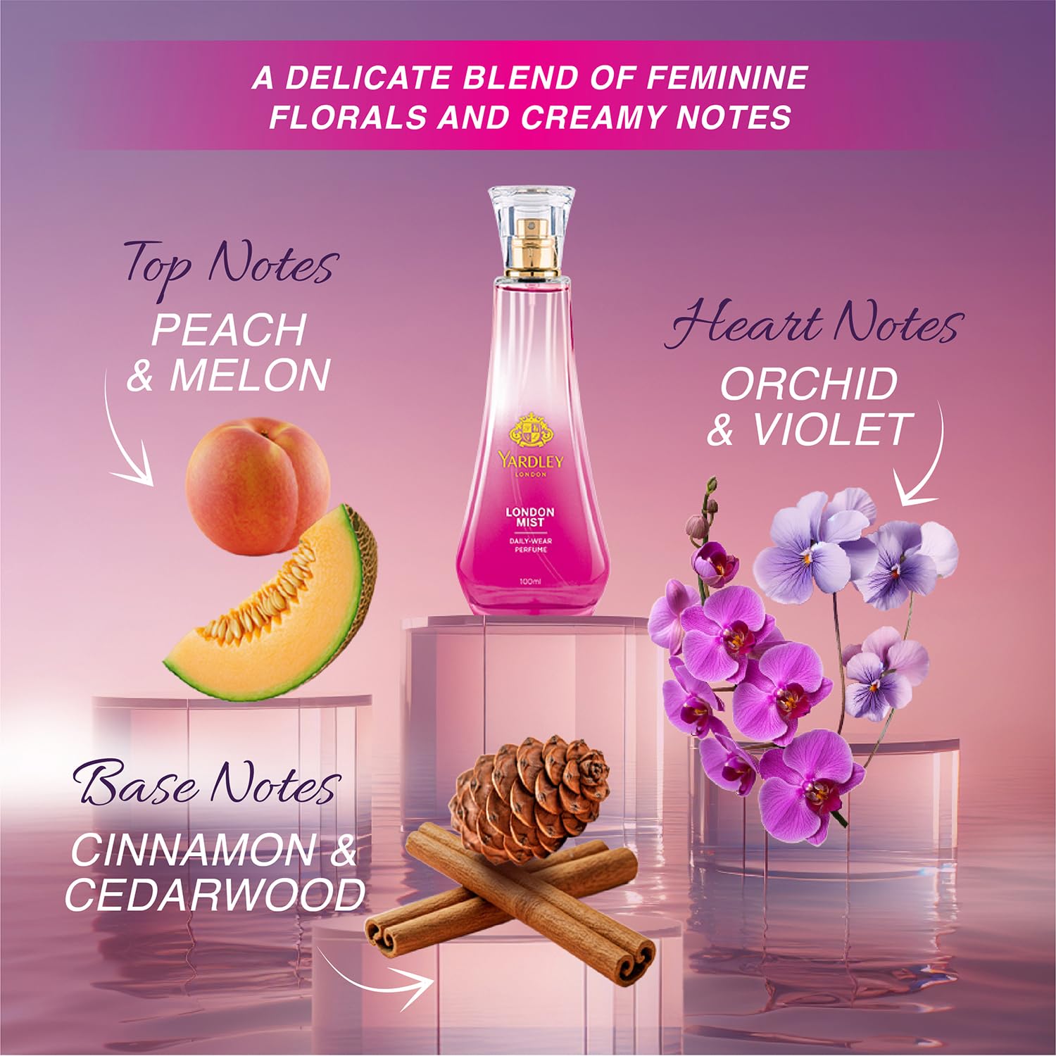 Capture the essence of feminine romance with Yardley Londonâs London Mist Daily Wear Perfume. Immerse yourself in the delicate beauty of misty English meadows with this cologne spray for women where every step leads to a floral feast for your senses. The fragrance of this DWP encapsulates the "Romance of being a woman" inviting you to escape to the countryside and indulge in the luxurious aroma of London Mist. London Mist Daily Wear Perfume is a harmonious blend of fruity and floral notes that create an enchanting bouquet. The effervescence of Melon and Peach introduces a playful and refreshing aura while soft Orchid notes add an element of sophistication. The fragrance evolves into a long-lasting woody embrace with warm and comforting notes of Cinnamon. Handpicked from exotic English gardens the rich ingredients in London Mist create a fragrance perfect for daily wear and special occasions. Each spray envelops you in a sublime experience celebrating your individuality with a delicate balance of strength and softness.With a legacy of over 250 years Yardley London is a symbol of English luxury and quality. Our fragrances capture the exquisite floral scents straight from the fields of the English countryside celebrating the quintessential essence of feminine beauty. Experience the allure of London Mist Daily Perfume and embrace the romance of being a woman.