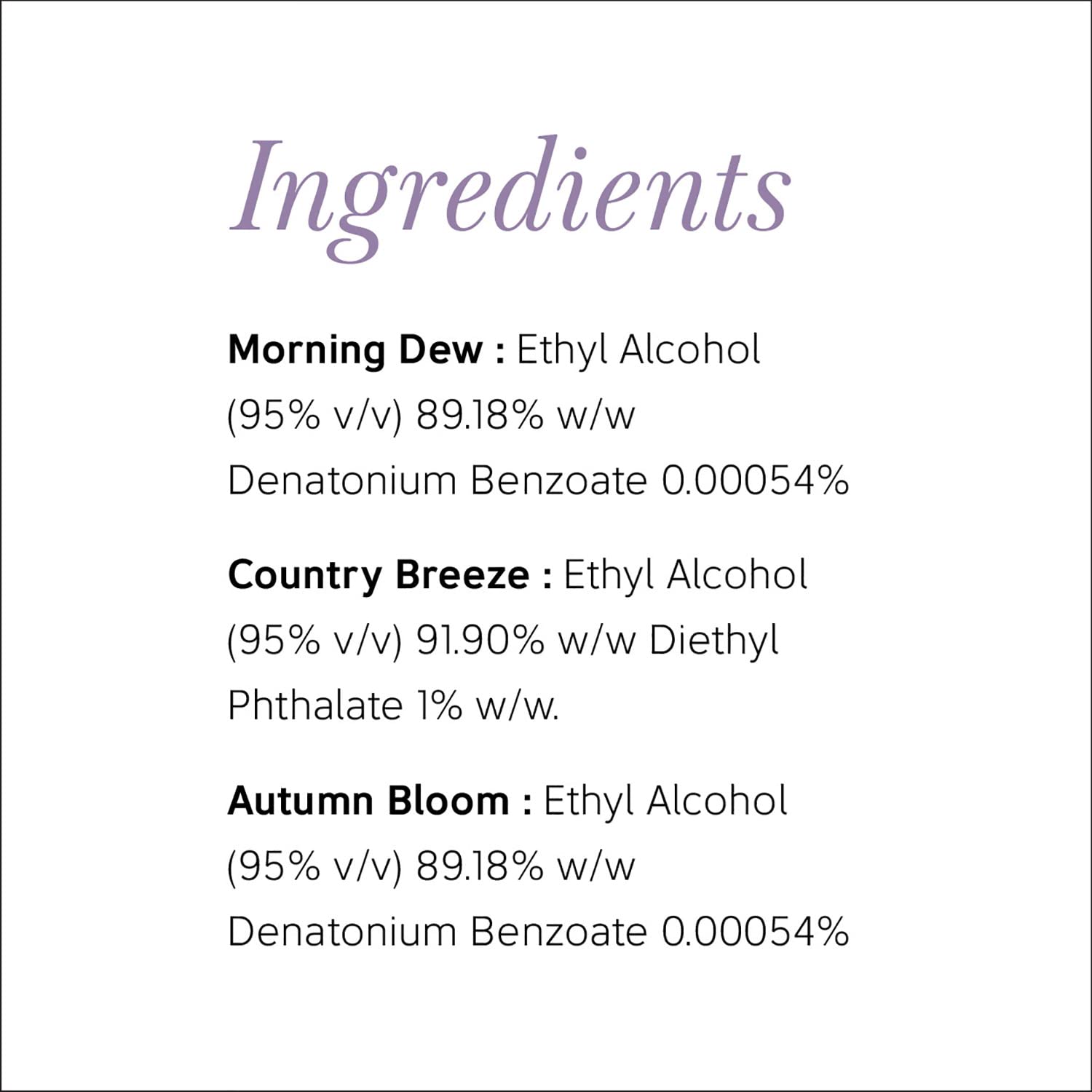 Experience the essence of Yardley London's Compact Perfume Assorted Pack a curated collection that brings together the invigorating Morning Dew the sweet Autumn Bloom and the enchanting Country Breeze. In the Morning Dew variant Freesia and Rose blend with Mandarin's uplifting touch creating a subtle trail of Musk for all-day freshness. Autumn Bloom harmoniously blends Apple Bergamot Rose and Apple Blossom encapsulating the warmth and sensuality of autumn. Country Breeze captures the English countryside with Mandarin Bergamot Jasmine and Freesia offering a delightful journey in each spritz. Conveniently sized for on-the-go luxury this assorted pack is a 250-year legacy of Englishness quality and the magic of natural fragrances from The House of Yardley. Elevate your daily ritual with this collection expressing your vibrant confident self and capturing the essence of diverse and enchanting scents.