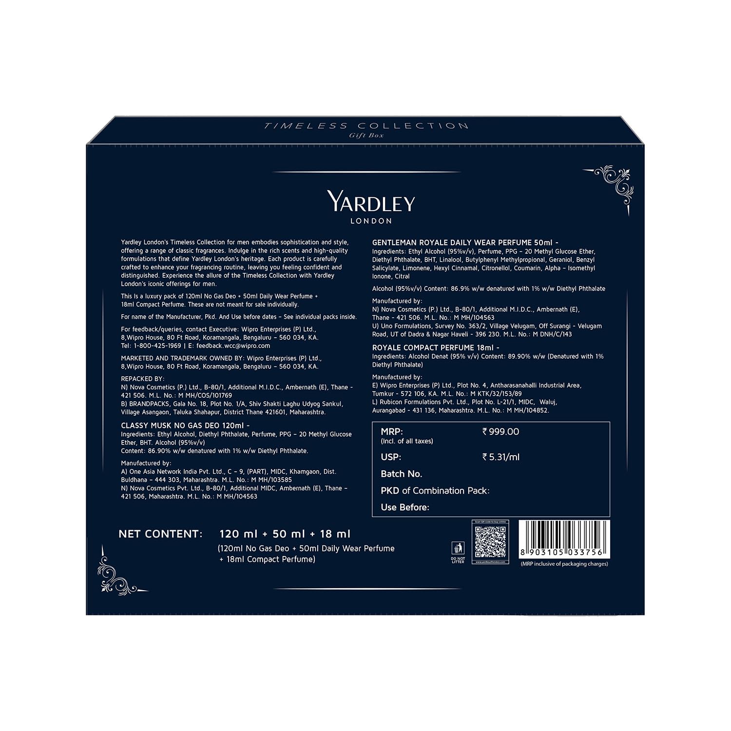 Experience sophistication with the Yardley London Gentleman Timeless Gift Collection For Men. This curated collection includes the Gentleman Royale DWP and Compact Perfume alongwith Classy Musk No Gas Deodorant Body Spray Perfume a symbol of class and distinction for the modern gentleman. Blending citrus and musk with bergamot top notes and spicy accents this fragrance part of the Elite Collection exudes an aura that perfectly complements the accomplished man's persona. The pack also features the Gentleman Royale Perfume an exquisite blend of Lime Ozonic accords Nutmeg Wood Pepper and hints of Dark Chocolate. With up to 250+ intense sprays and premium packaging it ensures lasting freshness and regal essence. Yardley with over 250 years of legacy stands as England's prestigious purveyor of quality perfumes symbolising Englishness luxury and natural fragrances. Elevate your daily presence with the Yardley Gentleman Assorted Perfume Pack embracing timeless elegance and establishing your presence with confidence and style.