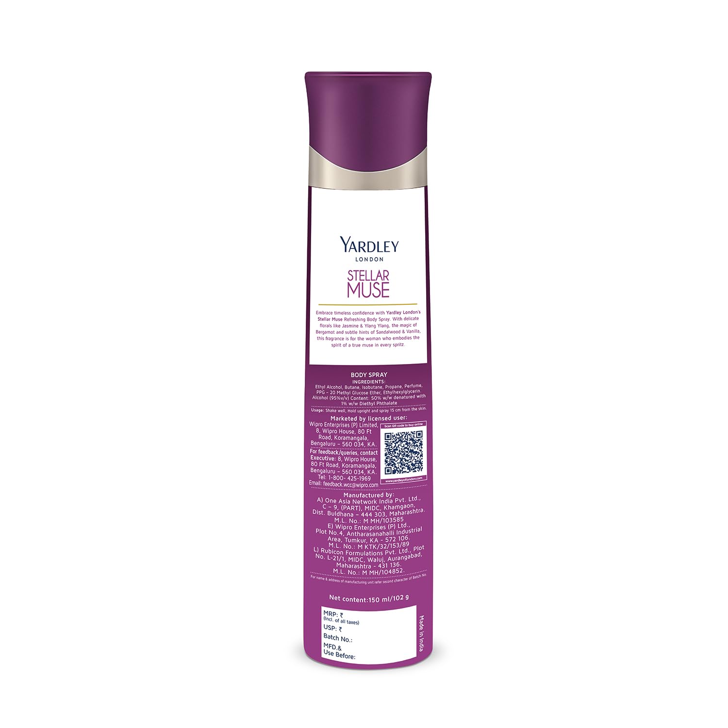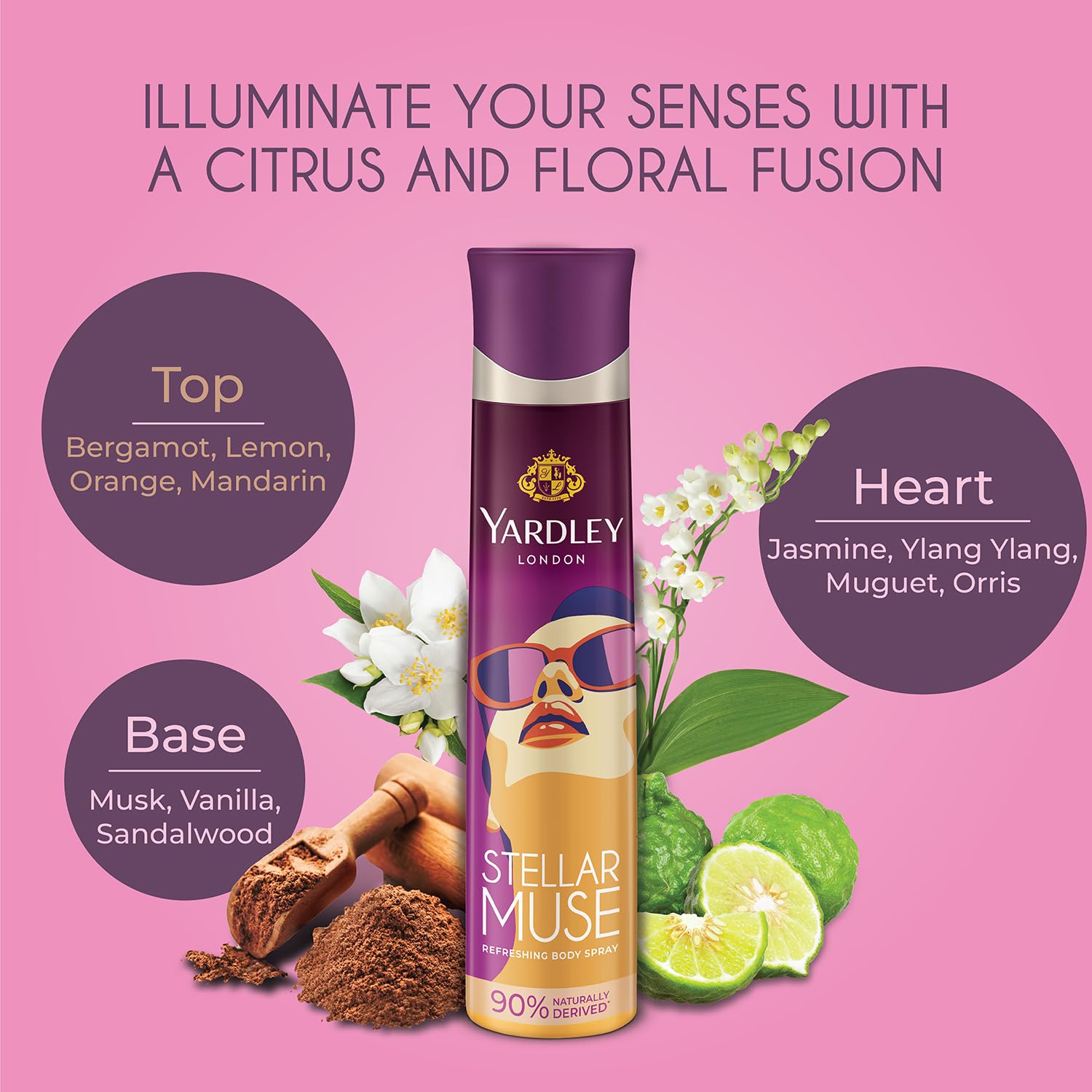Embrace timeless confidence with Yardley London's Steller Muse Refreshing Body Spray with delicate florals like Jasmine & Ylang Ylang the magic of Bergamot and subtle hints of Sandalwood & Vanilla this fragrances is for the woman who embodies the spirit of a true muse in every spritz.
