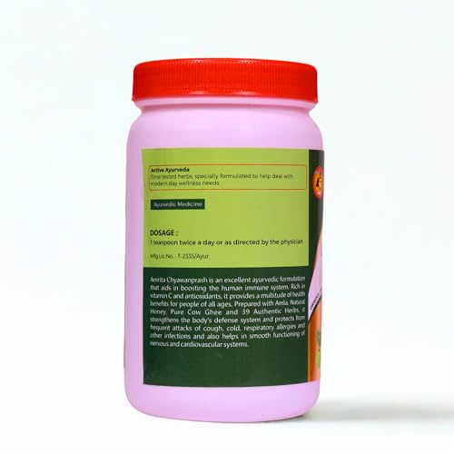 Made from fresh Amla, pure honey and 39 ayurvedic herbs, Amrita Chyawanprash contains excellent Anti-oxidant properties. It strengthens bodys immunity system thereby protects from common cold, cough, respiratory allergies and other infections. It helps in smooth functioning of the nervous and cardio-vascular systems.