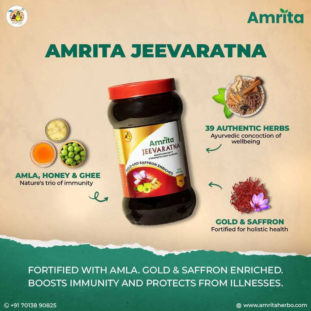 Amrita Jeevaratna is an excellent ayurvedic formulation that aids in boosting the immune system. Prepared with Amla, Natural honey, Pure cow ghee and 39 Authentic Herbs, it strengthens bodys defense mechanism, protects from infections like cough & cold, respiratory allergies. Fortified with Gold & Saffron, it provides multitude of health benefits for the entire family.