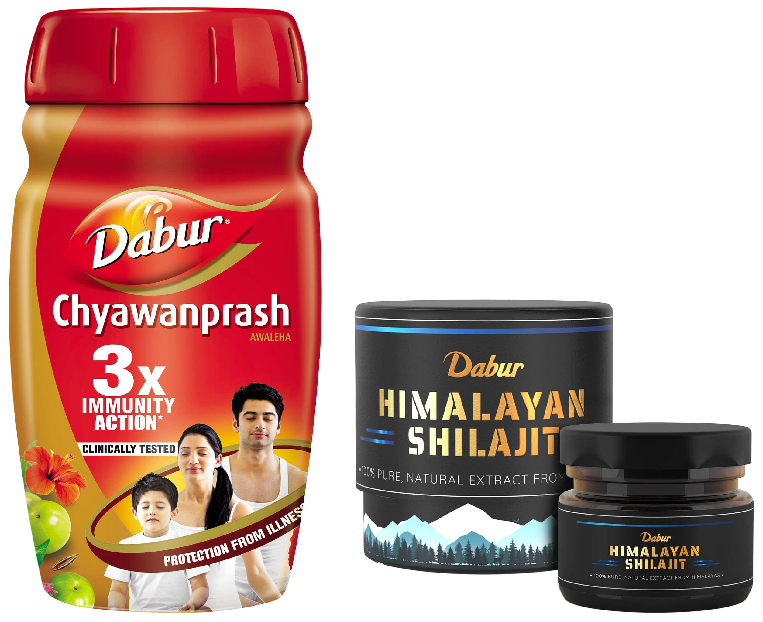 Dabur Chyawanprash â 950g 2X/3X Immunity helps build Strength and for StaminaDo you think your child has inner strength? Do you worry that your child will fall ill? Do you feel that your child may miss school due to falling ill? Do you doubt that only good food is not enough for your childâs good health? If your answer to any of the above questions is yes then Dabur Chyawanprash is the answer to your childâs health worries - A recipe used in Ayurveda since ancient timeschyawanprash offers a wide range of health benefits. Dabur Chyawanprash provides strong immunity and good digestion for children and adults alike. Two spoons daily of Dabur Chyawanprash supports immunity and is beneficial for overall health and well-being. It is also good for the digestive and respiratory systems. The primary action of Dabur Chyawanprash is to bolster the immune system and to support the bodyâs natural ability to fight illnesses . Amalaki (the main ingredient) aids in the elimination of ama (toxins). Therefore regular use of Dabur Chyawanprash helps strengthen bodyâs natural defence systems. It builds the essence of immunity promoting systemic health and well-being. ingredients of Dabur Chyawanprash are scientifically validated for their beneficial effects on health. It is considered one of the best family tonicsâsuitable for all ages from young children to the elderly. (Children above 3 years of age).Dabur 100% Pure Himalayan Shilajit Resin 15g | Boosts Stamina and Energy| Immunity BoosterDabur Himalayan Shilajit is 100% Pure Natural extract from Himalayas that helps fight fatigue and improves immunity; Relieves stress and anxiety; strenghtens bones and muscles; Builds stamina and Vitality; and Supports healthy ageing