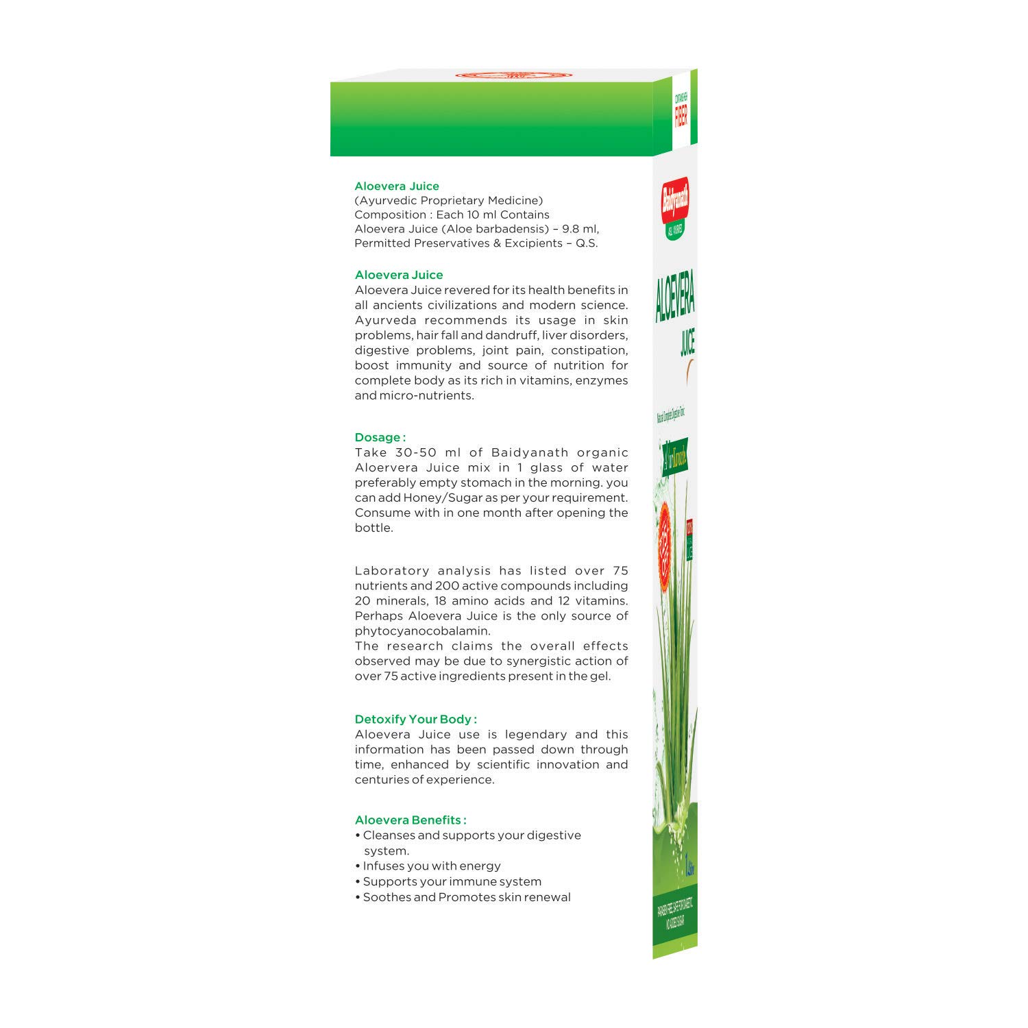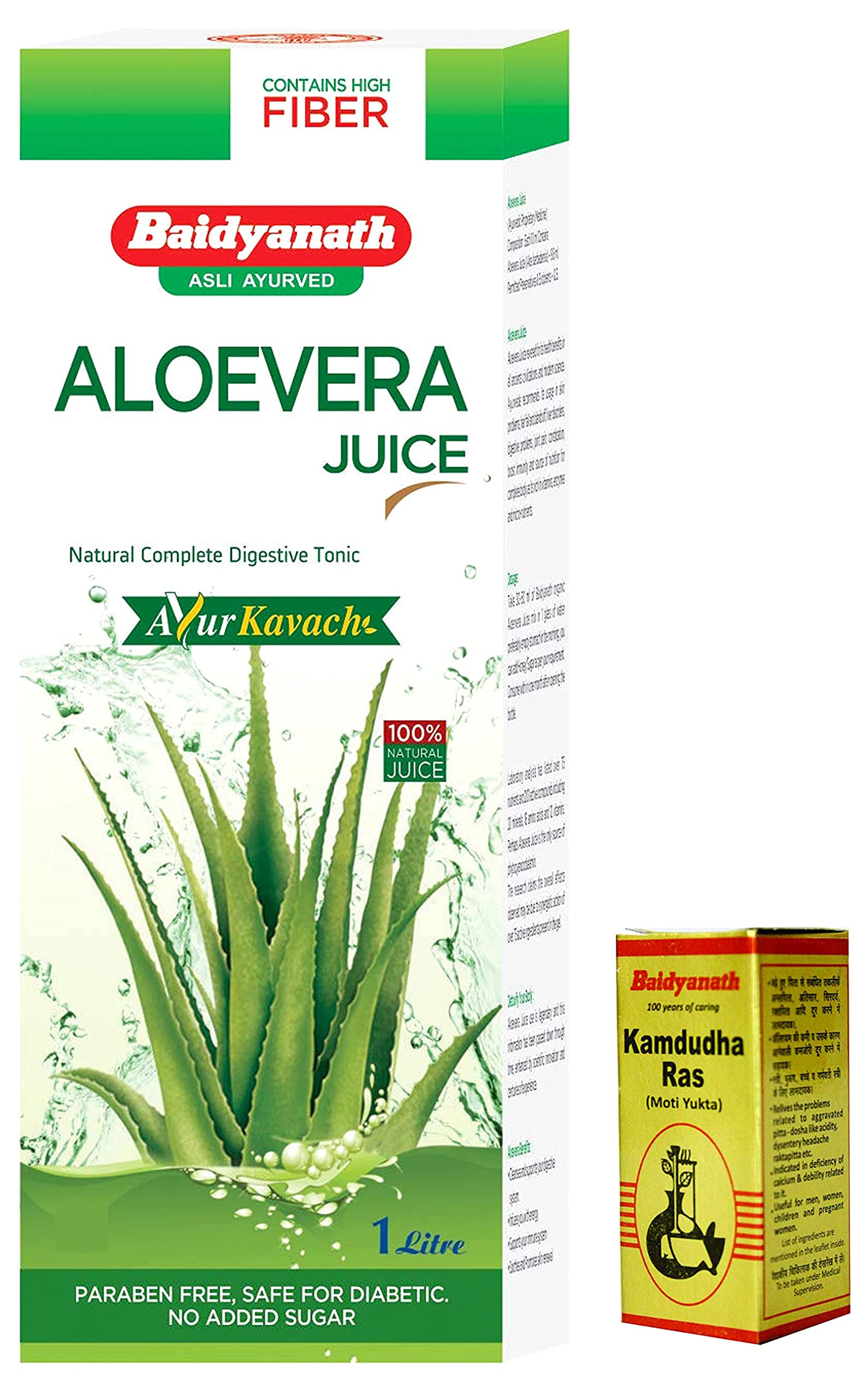 Baidyanath Aloe Vera juice with Pulp All Natural tonic for Immunity Better digestion and Glowing Skin 1000 mlBaidyanath Aloe Vera Juice with pulp condenses the magical benefits of this herb into a healthy herbal and wholesome drink. It boosts immunity builds a healthy digestive system and gives relief from constipation. Reduces fat and tones your body. It protects your liver. Alleviates skin allergies.Baidyanath Aloe Vera Juice is 100% pure natural & fre from any synthetic flavor & color. It contains several vitamins and minerals that your body needs for its good nutrition.Baidyanath Kamdudha Ras Moti Yukta - 25 Tablets GoldBaidyanath Kamdudha Ras Moti Yukta - 25 Tablets Shree Baidyanath Ayurved Bhawan (Kolkata) popularly known as Baidyanath is the acknowledged leader of Ayurvedic know-how. Established in 1917 the Company has played a pioneering role in re-establishing ancient knowledge with modern research and manufacturing techniques.