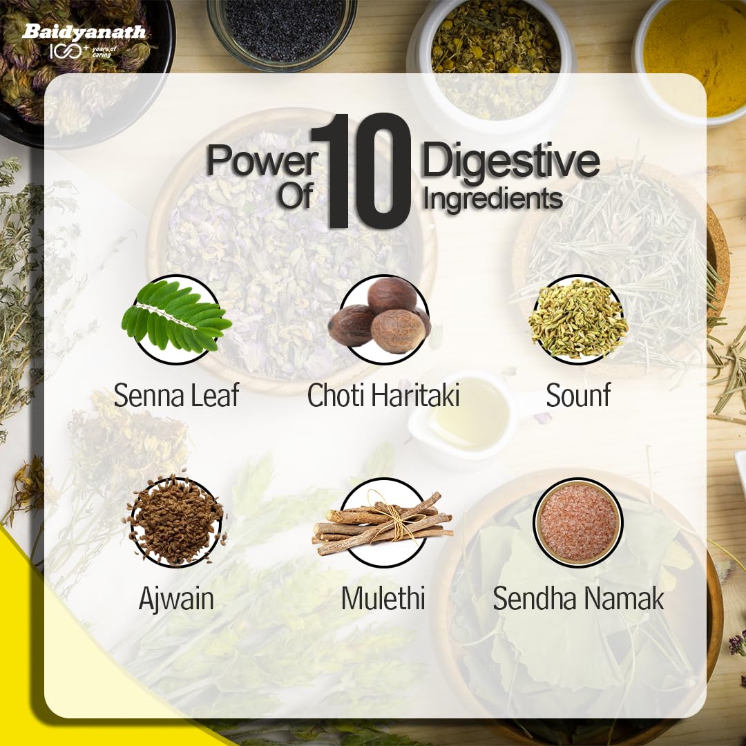 Baidyanath Kabz Har is an expert-researched Ayurvedic formula that helps relieve constipation. It is a powerful blend of 10 digestive ingredients like Sonth (Ginger) Sounf Ajwain Choti Haritaki Nishoth Senna Leaf & more that contributes to a healthy digestive system. This no-cramp non-habit-forming formula also helps relieve gas indigestion acidity & allied problems.