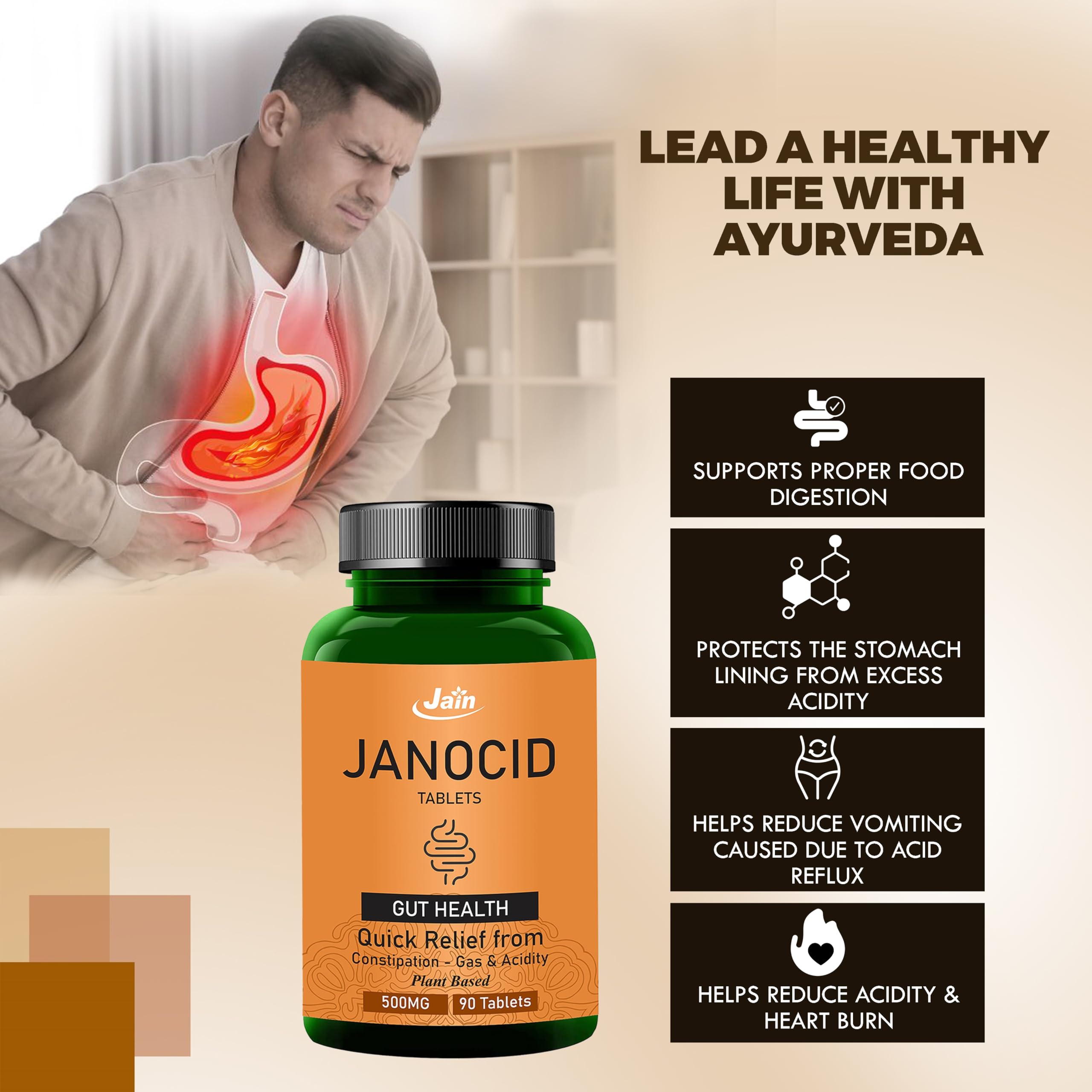 Janocid is a proprietary Ayurvedic formulation manufactured by Sri Jain Ayurvedic Pharmacy Hyderabad. It is designed to address common digestive issues such as acidity constipation bloating and indigestion. The tablet combines traditional herbal ingredients known for their digestive and detoxifying properties.