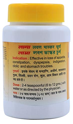 Lama Lawan Bhaskar Churna formulated from a 100 percent natural blend of ingredients is effective in treating various stomach related disorders such as loss of appetite constipation dyspepsia indigestion clolic & stomach troubles. This churna is a mix of various salts that cures acidity soothes irritation in the stomach lining that is caused by hyperacidity. It also helps boosts digestion by stimulating enzyme production.