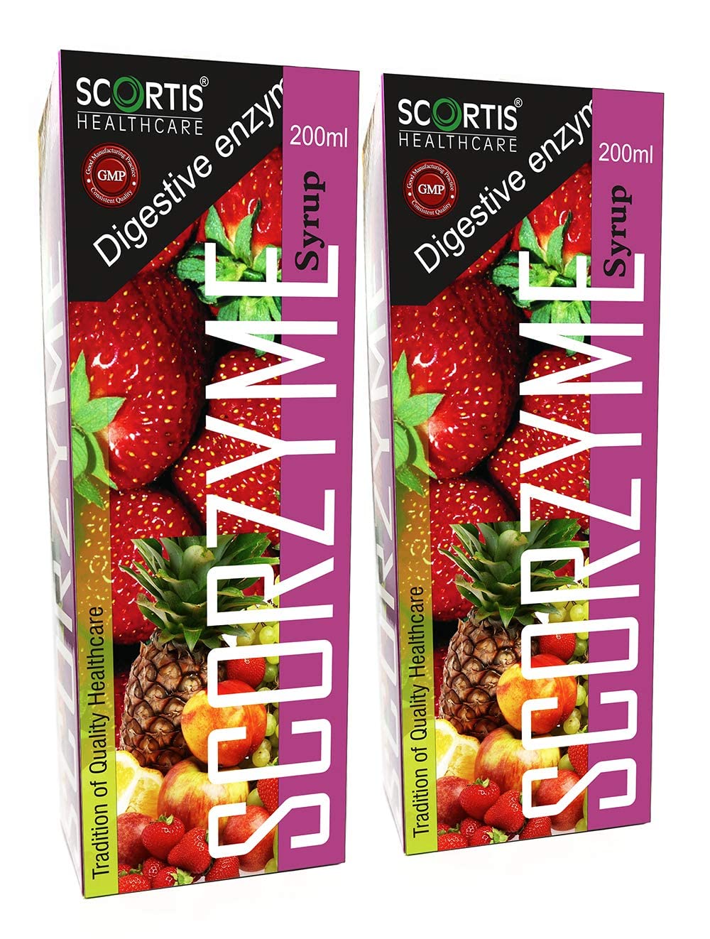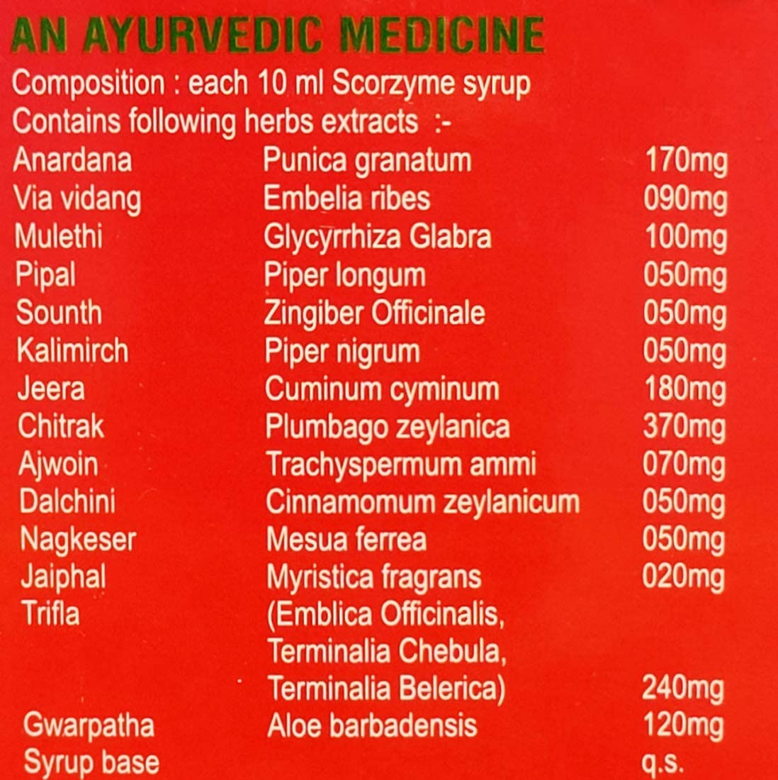 • Scorzyme Syrup contains digestive enzymes which are natural substances needed by the body to help break down and digest food.