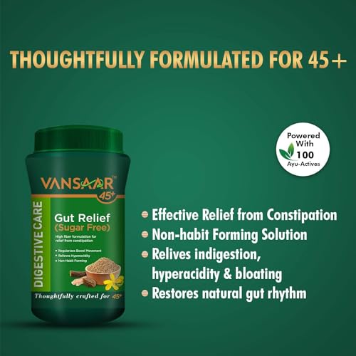 Vansaar Gut Relief is a high fiber ayurvedic digestion supplement for fast (overnight) and effective relief from constipation as it acts as a natural stool softener and helps get natural relief from hard stool constipation. Gut Relief powder helps in regularizing bowel movement and brings relief from hyperacidity indigestion abdominal bloating and gas. It is a sugar-free ayurvedic non-habit forming formulation made with Isabgol Senna leaves Ajwain Choti Harre Amaltas Mulethi & Sonth.