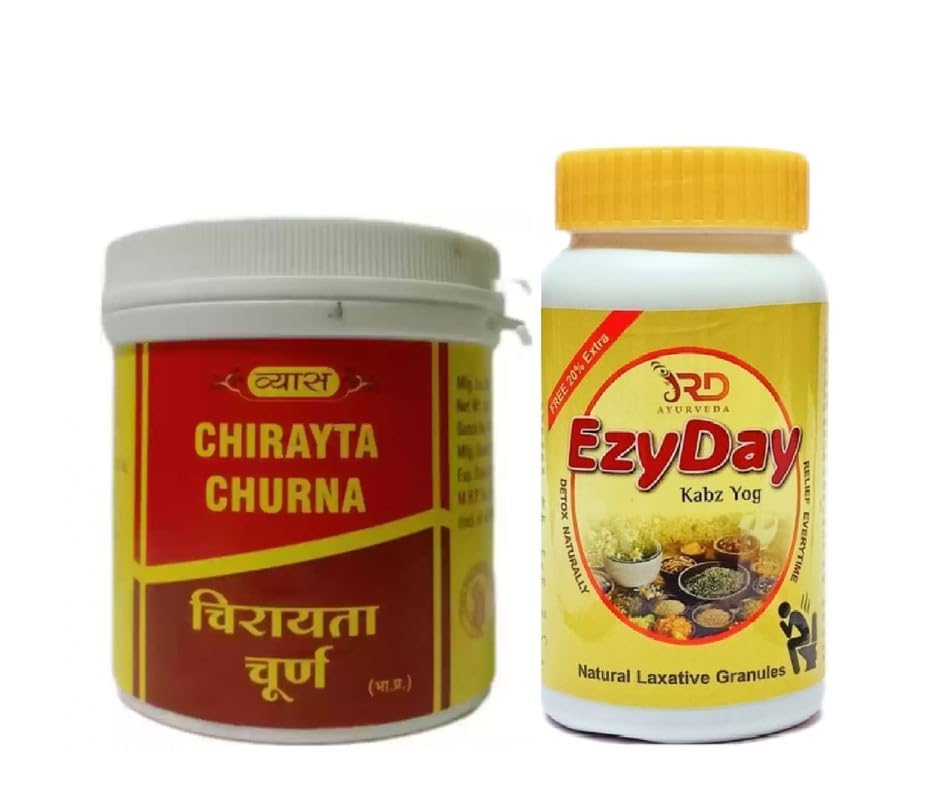 This powerful Ayurvedic combo includes Chirayata Churna (100g) and EzYday Kabz Yog (120g) â a complete herbal solution to support gut health relieve constipation and detox the liver. Chirayata Churna is a bitter tonic traditionally used for its detoxifying anti-inflammatory and blood-purifying properties. It supports liver function and helps in cases of indigestion sluggish metabolism or skin issues. EzYday Kabz Yog is a balanced blend of herbs like Isabgol Trivrit and Haritaki that relieve constipation ease gas and promote regular bowel movements â all without dependency or side effects. Ideal for those suffering from: 1. Constipation or irregular bowel habits 2. Bloating acidity and indigestion 3. Toxin build-up and liver sluggishness 4. Poor appetite and skin breakouts How to Use: Take 1 teaspoon of Chirayata Churna in warm water every morning. Take 12 teaspoons of EzYday Kabz Yog at bedtime with lukewarm water or as directed by a physician.