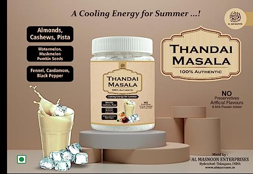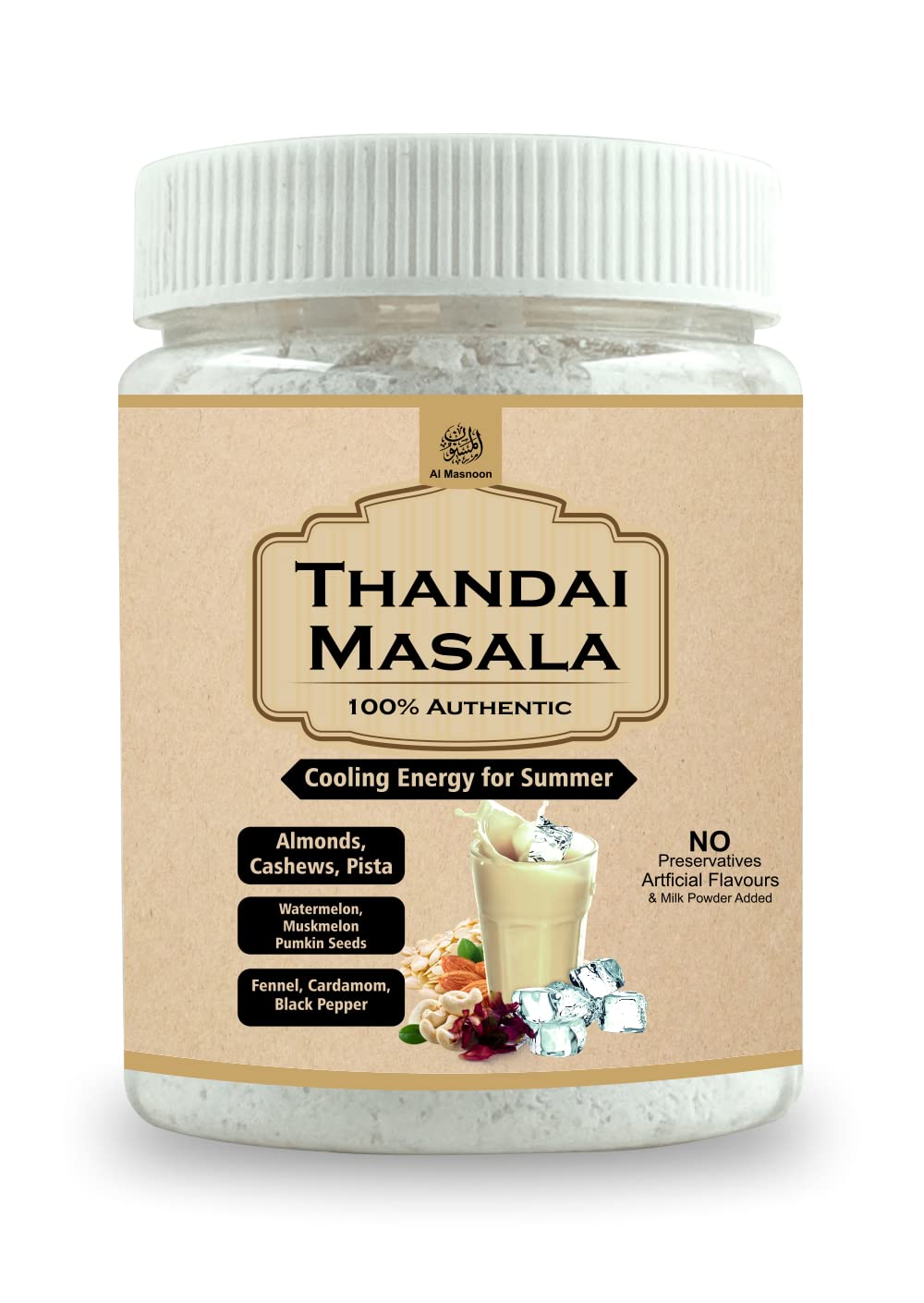 AL MASNOON Thandai Masala offers a refreshing blend of traditional Indian spices and herbs specially crafted to provide cooling energy during the summer months. This 250g pack contains a meticulously balanced mixture of ingredients known for their cooling properties such as almonds fennel seeds cardamom and rose petals. Ideal for preparing thandai a popular North Indian beverage this masala ensures a delightful flavor profile that invigorates and rejuvenates in hot weather. Enjoyed traditionally during festivals like Holi and Mahashivratri this blend promises a burst of aromatic goodness with every sip making it a perfect choice for cooling down and staying refreshed during the sweltering summer days.