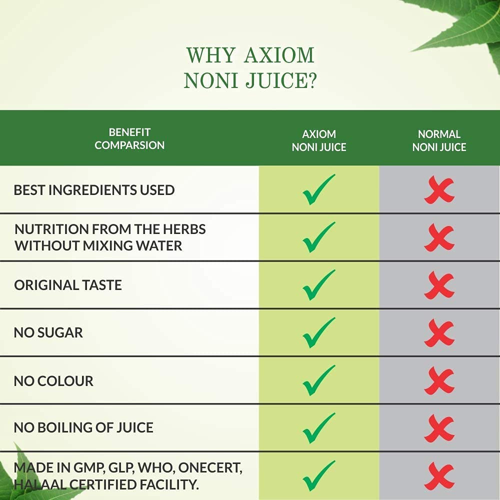 HomeHealth & PersonalDiet & NutritionHealth DrinksAxiom Ayurveda Noni Juice 500 ml | Immunity Booster | Made with Fresh Noni Fruit | WHO GMP GLP Certified Product | No Added Color | No Added Sugar Pack of 4