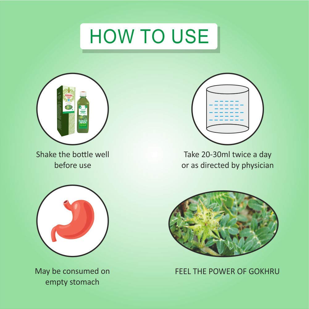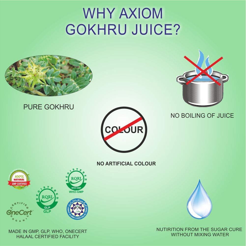 CERTIFICATION AND USES: Axiom Gokhru Juice is 100% Natural WHO GMP GLP certified. For best possible results consume 20-30ml twice a day with lukewarm water after meals or as directed by the physician.