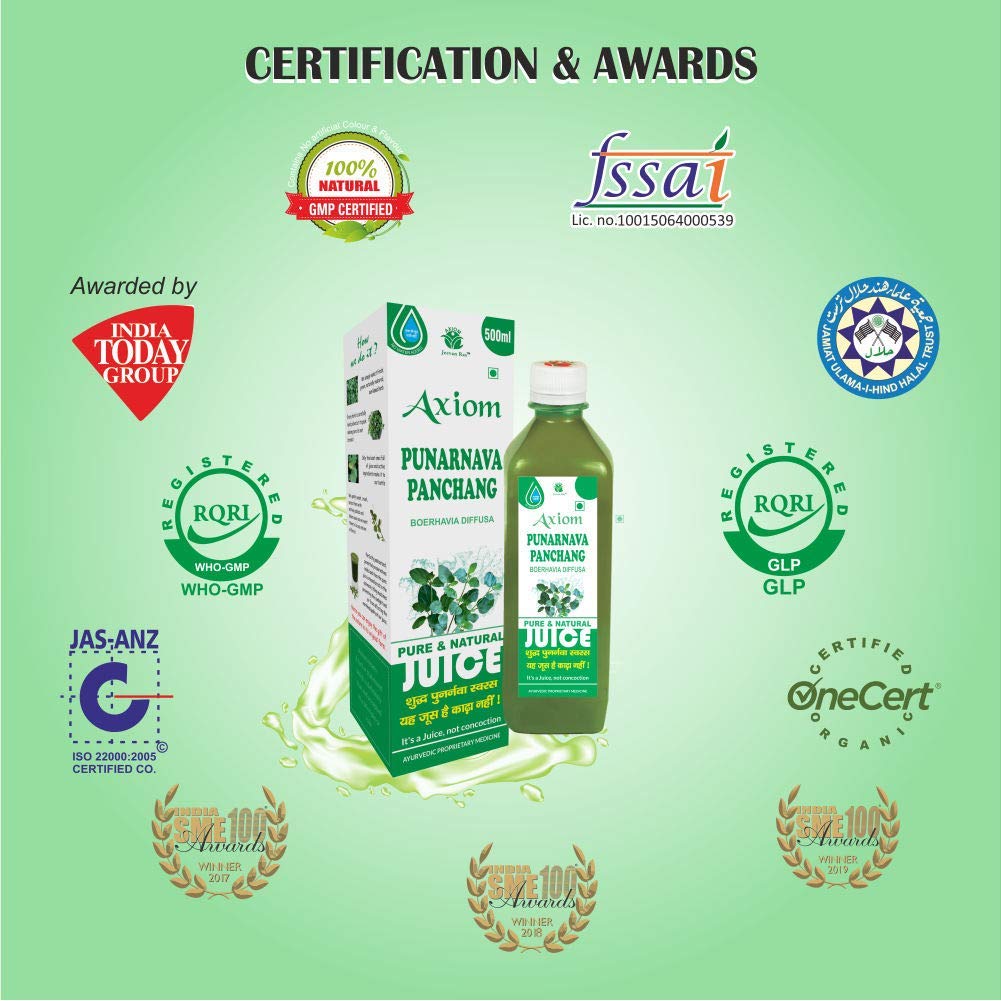 Certified. For best possible results consume 20-30ml twice a day with lukewarm water after meals or as directed by the physician CERTIFICATION AND USES: Axiom Punarnava Panchang Herbal Juice is 100% Natural WHO GMP GLP.