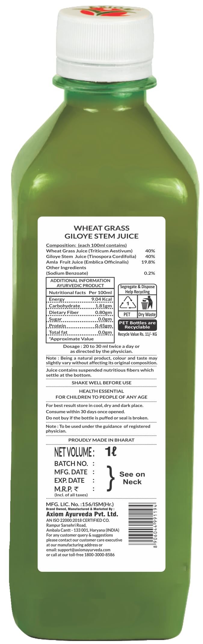 ENHANCES PLATELET COUNT: Axiom Wheatgrass Giloye Stem Juice is helpful during dengue fever this juice helps increase platelet count while also supporting overall health offering a natural solution to maintain optimal blood function.