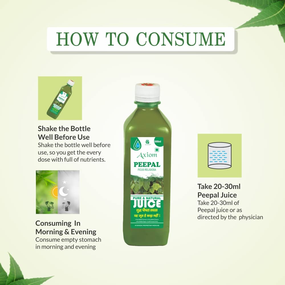 CERTIFICATION AND USES: Axiom Peepal Juice is 100% Natural WHO GMP GLP certified. For best results consume 20-30ml twice a day with lukewarm water after meals or as directed by the physician.