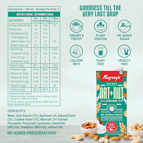 • No added preservatives or colors: Bagrrys Oat & Nut Drink retains the natural goodness of nuts and grain without any added preservatives colors or flavors. It is a wholesome option.