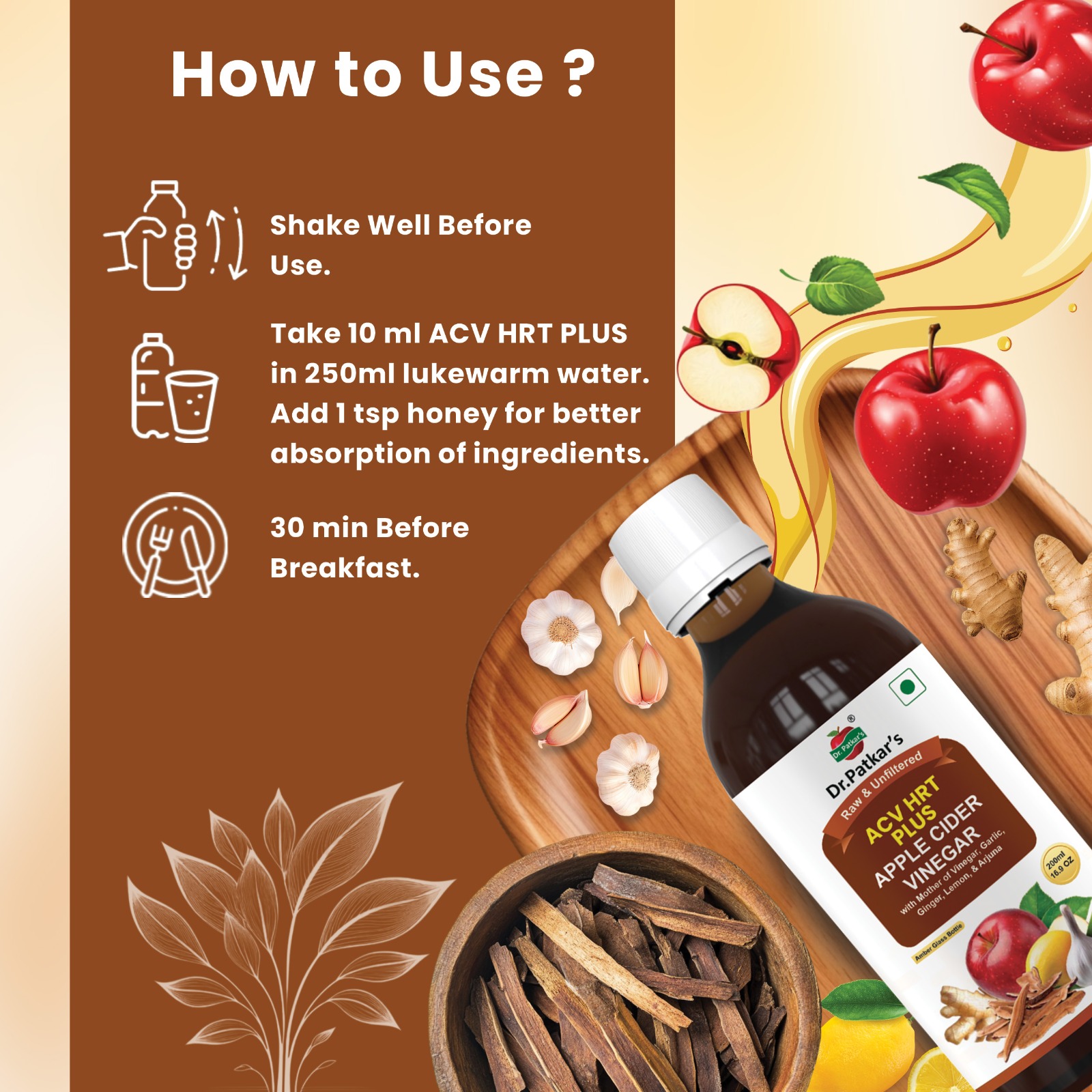 Dr. Patkar's Apple Cider Vinegar with Ginger, Garlic, Lemon & Arjuna (ACV HRT PLUS) + Formula Morning Detox Tonic Heart, Immunity & Digestion Support 200 ML (Pack of 1)