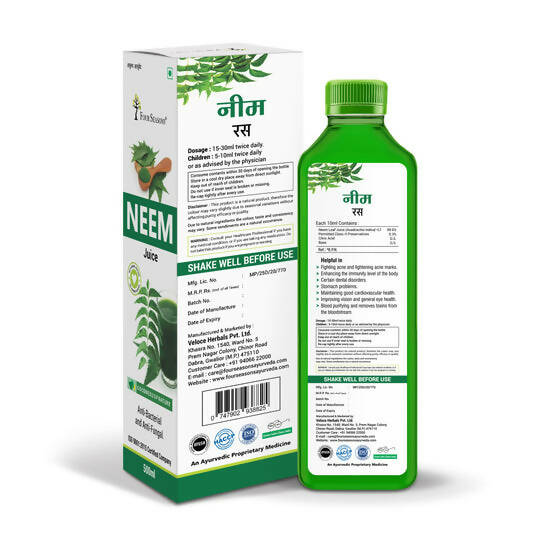 Four Seasons Neem JuiceFour Seasons Neem Juice is useful for various reasons as it may help treat inflammation, infections, fever, and certain skin diseases. It contains antibacterial and anti-fungal benefits. Neem helps to purify the blood and improve the immunity level of the body. Ingredient: NeemKey Benefits:May help in fighting acne and lightening acne marksIt is useful in treating and keeping dandruff at bayIt has antibacterial and anti-fungal propertiesMay help to enhance the immunity level of the body How to use:Use as directed by the expertLegal Disclaimer: Statements regarding dietary supplements have not been evaluated by the FDA.Note: Product images are for illustrative purposes only. Images/packaging/ labels may vary from time to time due to changes made by the manufacturer's manufacturing batch and location. The product description is for information purposes only and may contain additional ingredients.