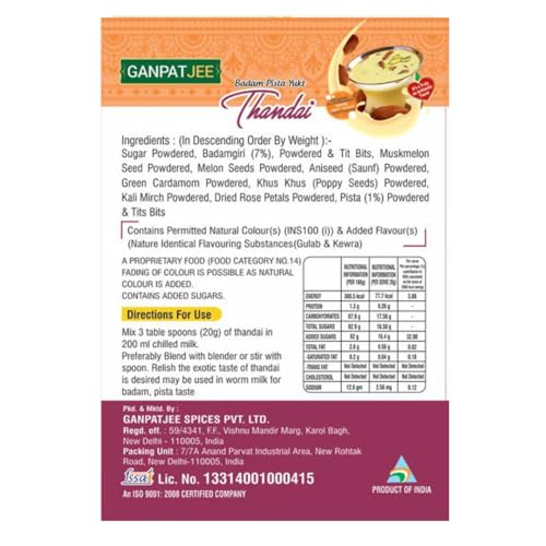 Introducing our exquisite Badam Pista Thandai a traditional Indian beverage crafted to tantalize your taste buds and refresh your senses. Inspired by the rich cultural heritage of India this indulgent concoction combines the goodness of almonds (badam) pistachios (pista) cardamom and an array of aromatic spices creating a symphony of flavors that is both luxurious and invigorating. Each sip of our Badam Pista Thandai offers a harmonious blend of creamy almond and pistachio flavors balanced perfectly with the subtle sweetness of sugar and the warmth of carefully selected spices such as cardamom black pepper. The infusion of these spices not only enhances the taste but also lends a distinct aromatic quality to the drink making it a sensory delight with every gulp. Whether enjoyed chilled on a scorching summer day or served warm during festive occasions like Holi or Diwali our Badam Pista Thandai promises to be a crowd-pleaser elevating any gathering with its rich flavor profile and cultural significance. It is a perfect beverage to celebrate the joyous moments of life with family and friends bringing a touch of tradition and sophistication to every occasion. Indulge in the decadent taste of our Badam Pista Thandai and experience the essence of Indian hospitality in every sip. Discover the perfect harmony of flavors crafted with care to delight your palate and leave you craving for more. Embrace the tradition savor the moment and let the flavors of India transport you to a world of culinary bliss.