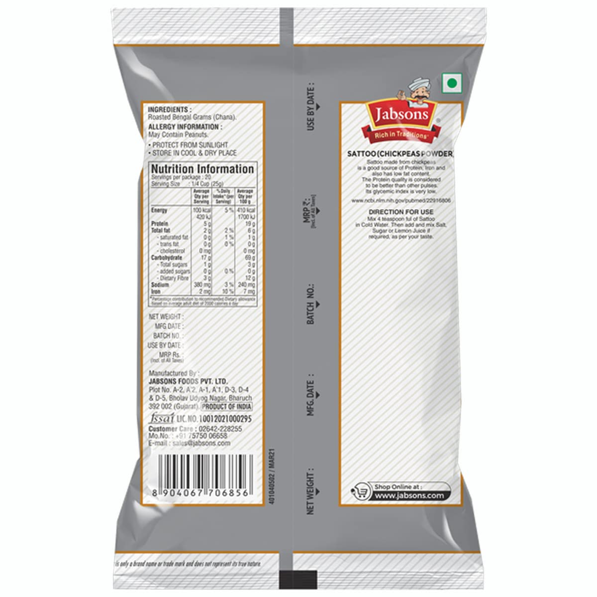 Jabsons - Sattoo Flour Indian Chana Powder 500 GM | Roasted Chana Flour | 100% Natural & Gluten Free Chana Sattu l High Fiber