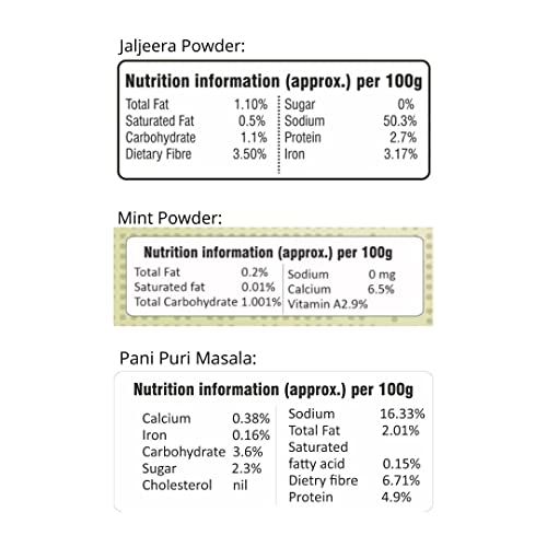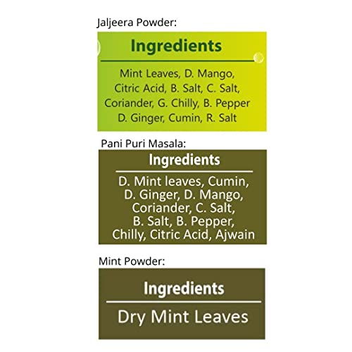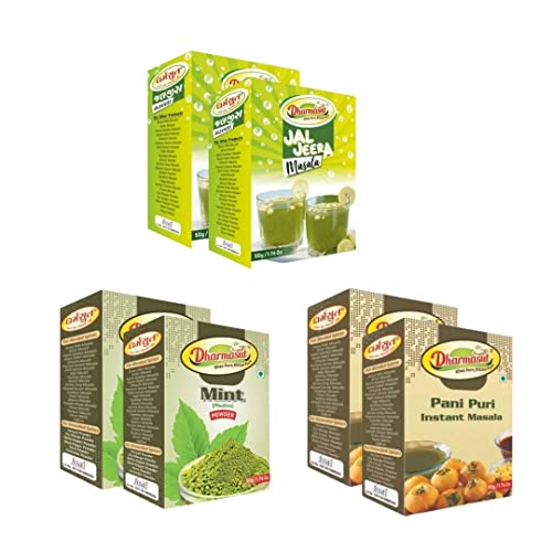 Dharmasut super masala combo includes Jaljeera Masala (50g*Pack of 2) + Pani Puri Masala (50g*Pack of 2) + Mint Powder (50g*Pack of 2). This jaljeera powder packet is used to prepare a cool refreshing drink called jaljeera a salted and spicy Indian lemonade. It has a unique flavor and can be a refreshing choice on a hot summer day. Pani Puri Masala is one of the tasty masalas to give you the flavor of the finest spicy pani puri at home. Preparing instant pani puri masala at home is not only a healthier alternative but also a great opportunity to customize it as you see fit. This is a ready to use pani puri masala that you can use right away to make your pani puri extra lazizz. Dried Mint Powder is an aromatic and flavourful condiment that makes dishes beverages all the more appetizing. Dry Mint Powder is good for health as it bolsters smooth digestion. You can enjoy dried mint leaves sprinkled over soups salads chutneys cooked vegetables fresh fruit or yogurt. Experience the real taste of spices and masala with Dharmasut Masala.