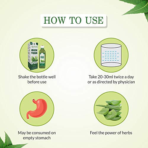 • CERTIFICATION AND USES: Axiom Aloevera Juice is 100% Natural WHO GMP GLP certified. For best results consume 20-30ml twice a day with lukewarm water after meals or as directed by the physician.