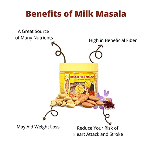 Dharmasut milk masala powder is well famous and rich in ingredients. Premium Kesari Milk Masala is made of High Quality and Purest dry fruits it includes small pieces of Badam Cashew Nuts Pista Mace Cardamom Synthetic Food Nutmeg and Saffron. Kesar Milk masala will give you the most astonishing taste and make you crave for milk every time. Milk masala powder is flavoured with kesar. The addition of milk masala powder with kesar doesn’t just make the milk taste a lot yummier but it also comes with a lot of health benefits which is great for your memory treats insomnia and softens the skin by regular consumption of this powder. Generally children do not like milk but adding our dudh masala powder will always make them crave for tastier milk. You can also use kesar badam milk masala powder while making Rabdi Kheer Barfi Halva Kesar Kulfi and other delicious sweets. Try our High Quality Milk Masala Powder once and make your sweets a lot delightful.