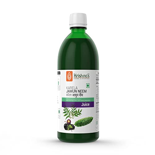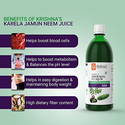 Krishna's Karela Jamun Neem juice is a daily tonic with numerous health benefits. karela Jamun and neem are beneficial for high blood sugar patients. Excellent source of vitamins B1 B2 folic acid mg Zinc phosphorus and has high dietary fibre.