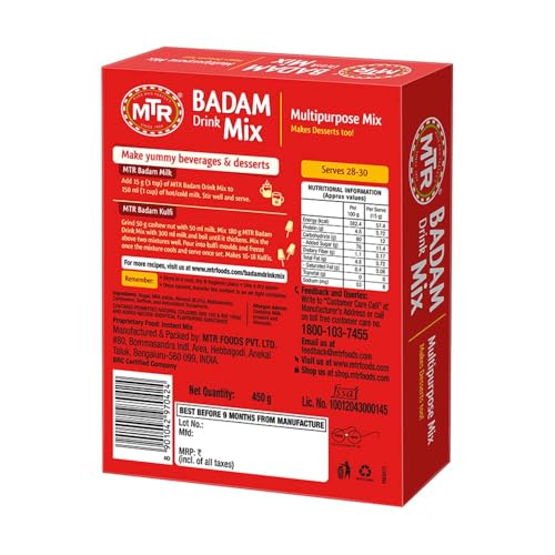 Explore wide range of Flavored Drink Concentrate from the house of Mtr on Amazon. Badam Drink Mix. Country of Origin: India. FSSAI License Number: 11217303000066. MTR Badam Drink is a multipurpose mix which is the perfect combination of Badam Kesar & Elaichi and so delicious that your child will now look forward to eating and drink. Since ancient times Badam and Kesar have been well known to possess natural qualities that are good for both body and mind and help in boosting immunity & strength.