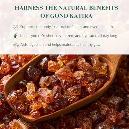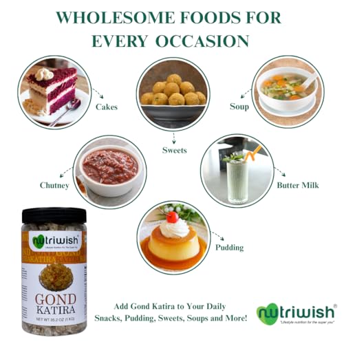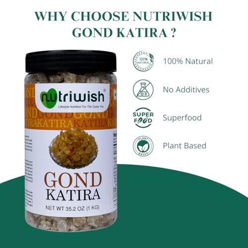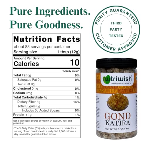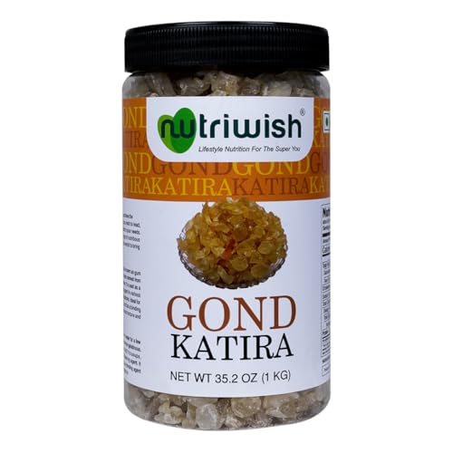 Nutriwish Gond Katira also known as gum tragacanth is a natural gum resin derived from the sap of the Astragalus tree. It is used as a thickening and stabilizing agent in various culinary and cosmetic applications. Ideal for soups sauces desserts and as a binding agent in recipes it enhances texture and consistency.