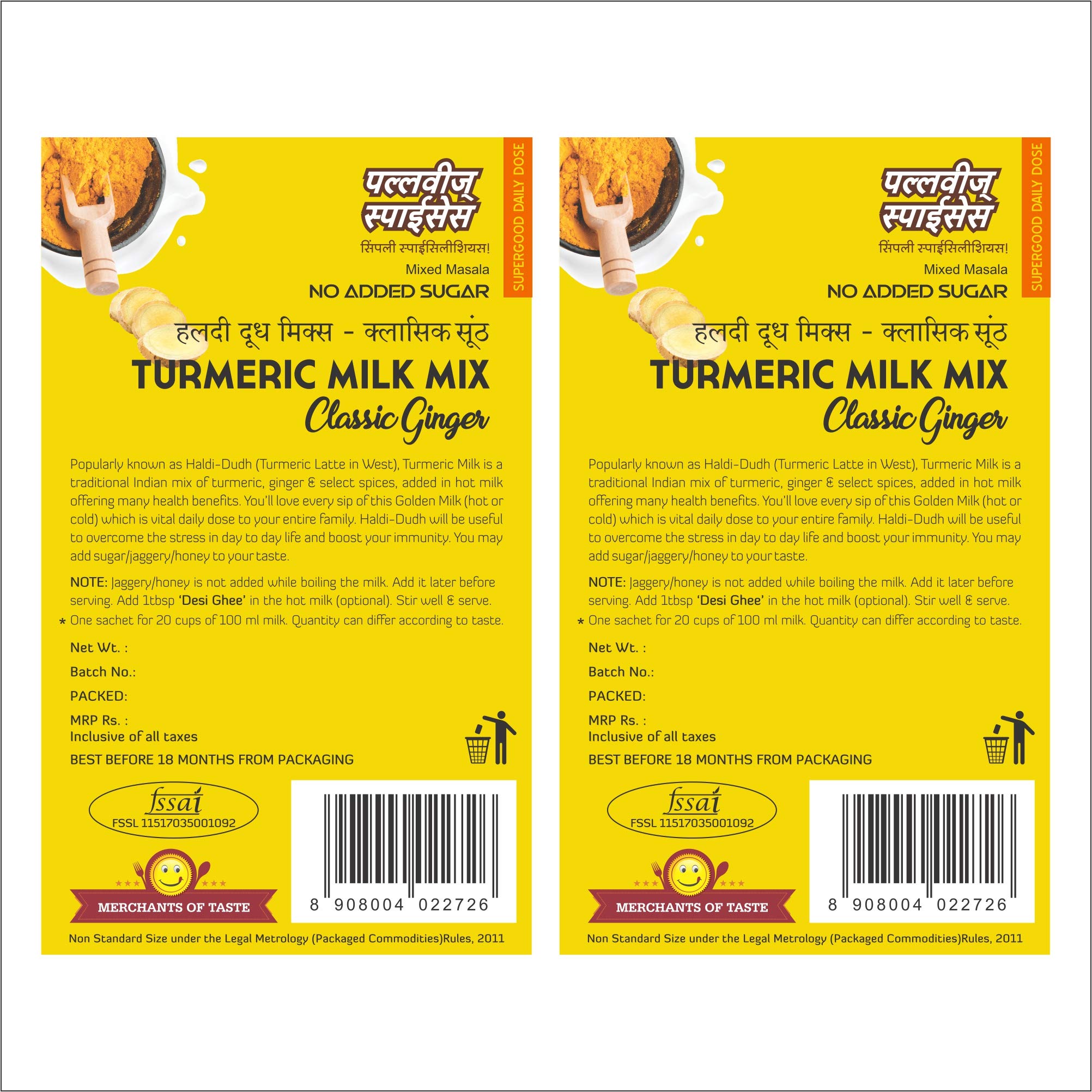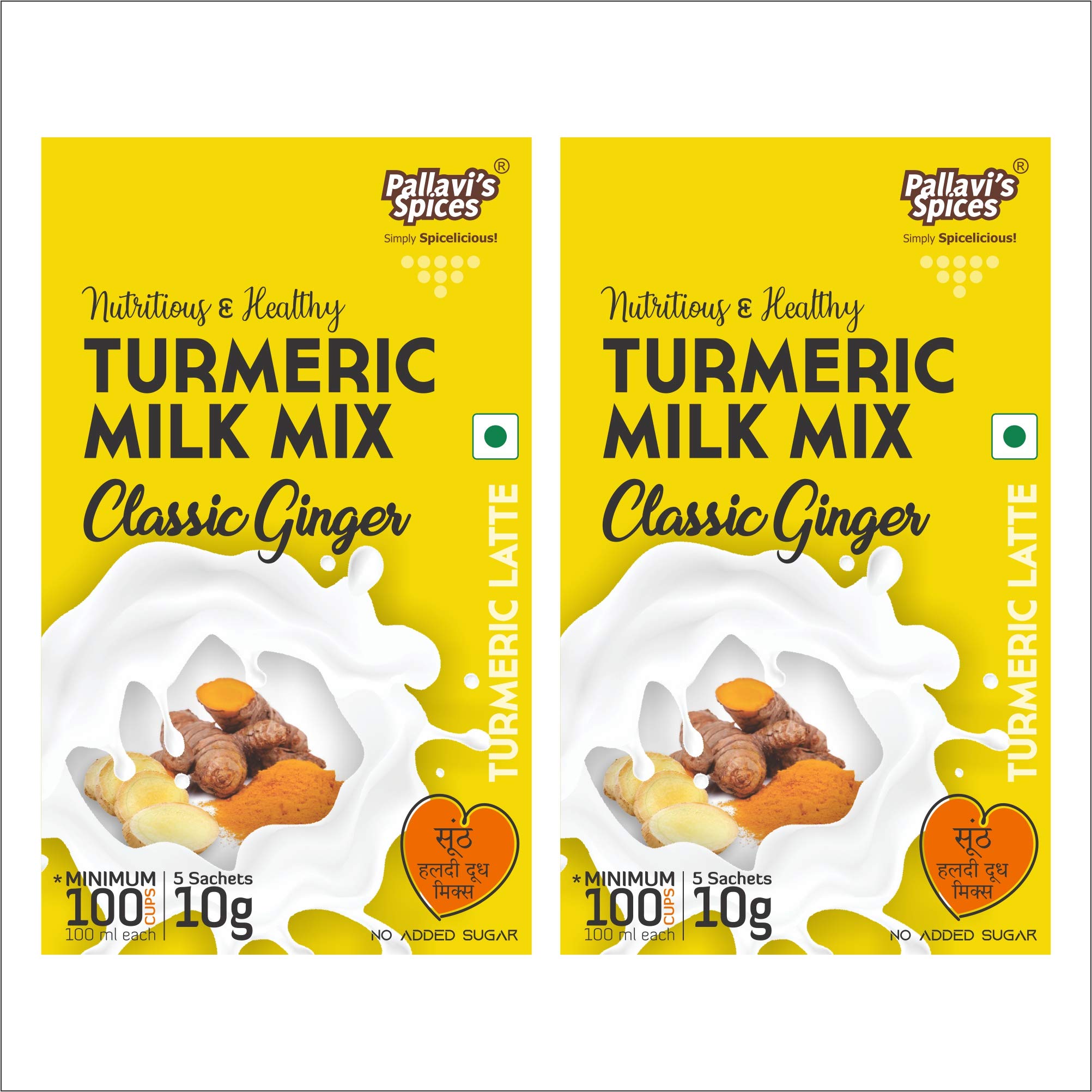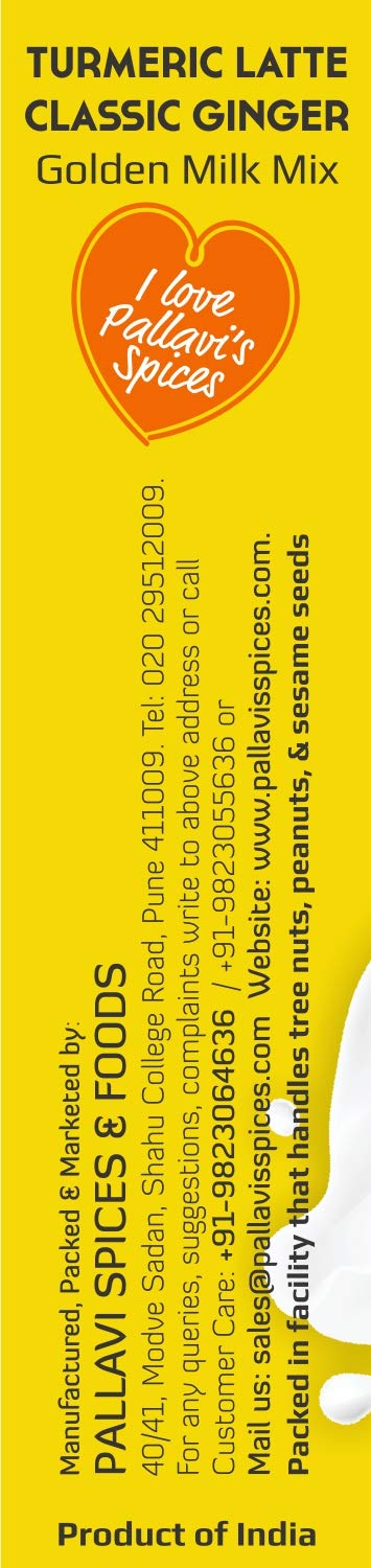 Turmeric Milk Mix Classic Ginger of Pallavi's Spices is made of Turmeric powder Ginger and select spices. To be added in hot milk. No added Sugar. Can add Sugar Jaggery Powder or Honey later. Use lesser quantity enjoy better quality. No added preservatives artificial flavours and msg.
