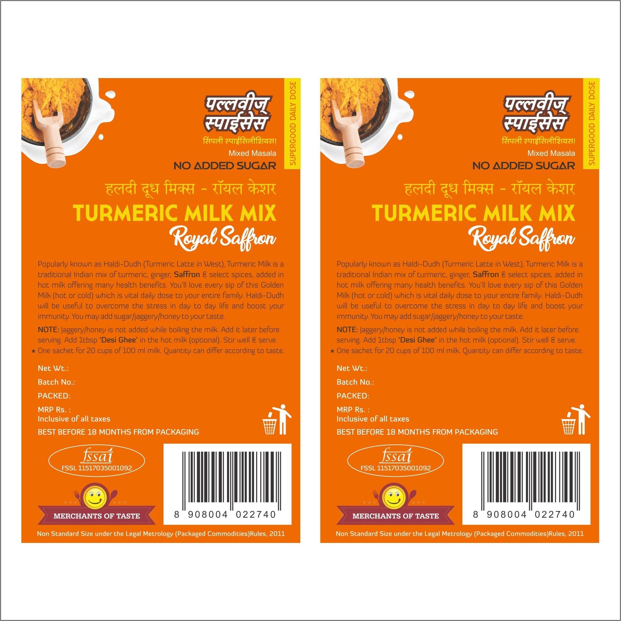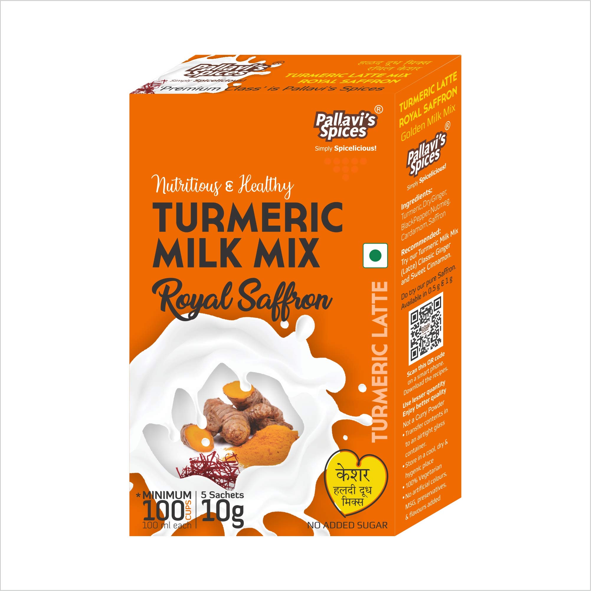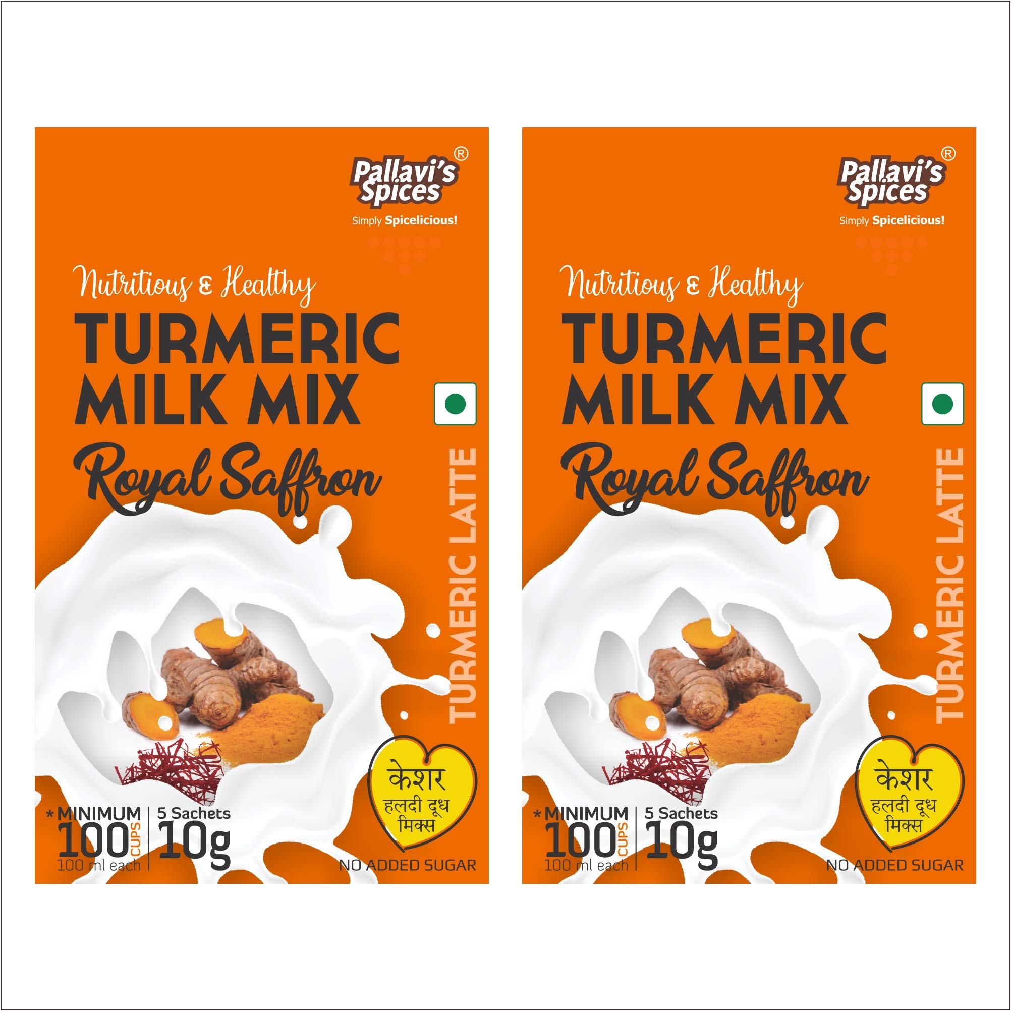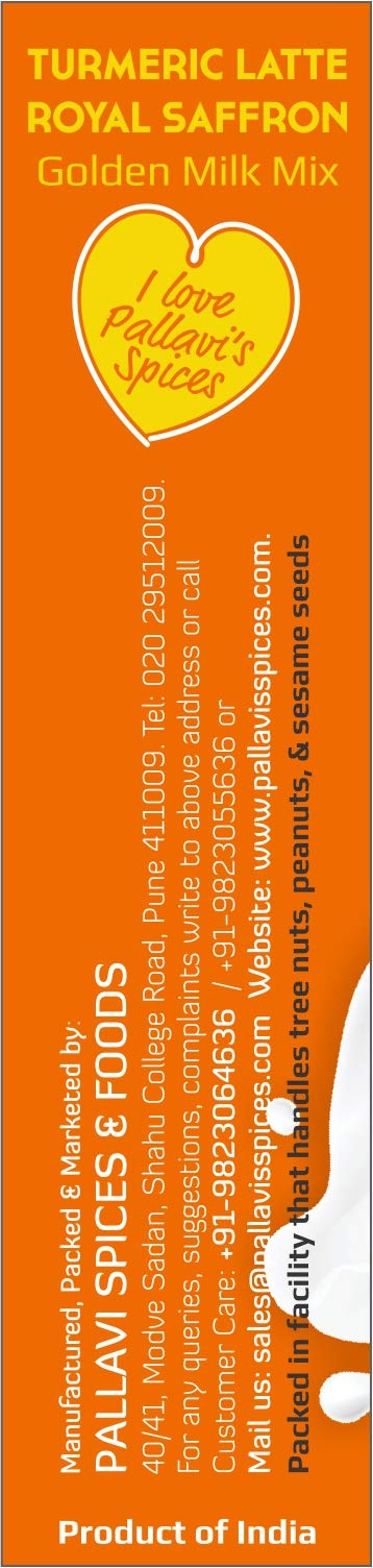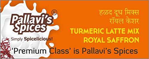 Turmeric Milk Mix Royal Saffron of Pallavi's Spices is made of Turmeric powder Mongra Saffron Ginger and select spices. To be added in hot milk. No added Sugar. Can add Sugar Jaggery Powder or Honey later. Use lesser quantity enjoy better quality. No added preservatives artificial flavours and msg.