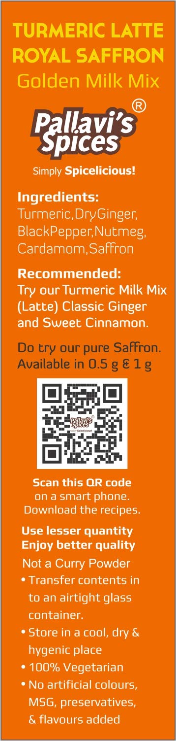 Pallavi's Spices Turmeric Milk Mixes has 1 Royal Saffron and 1 Sweet Cinnamon pack of 50g. One 50g pack each contains 5 sachets of 10g. One sachet is good for 20 cups of 100 ml milk. Quantity can differ according to taste. Popularly known as Haldi-Dudh (Turmeric Latte in West) this is a traditional Indian mix of turmeric ginger Saffron/Cinnamon & select spices added in hot milk offering many health benefits. Golden Milk (hot or cold) is a Supergood Daily Dose to your entire family and doesn't contain Sugar. Haldi-Dudh will be useful to overcome the stress in day to day life and boost your immunity. You may add sugar/jaggery/honey to your taste. Turmeric is well known for its anti oxidant and anti inflammatory properties. Add 1tbsp ‘Desi Ghee’ in the hot milk (optional). Stir well & serve. Note: Jaggery/honey is not added while boiling the milk. Add it later before serving.