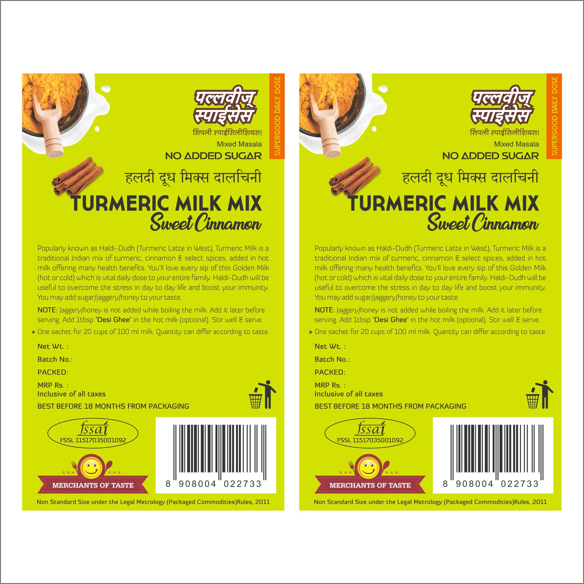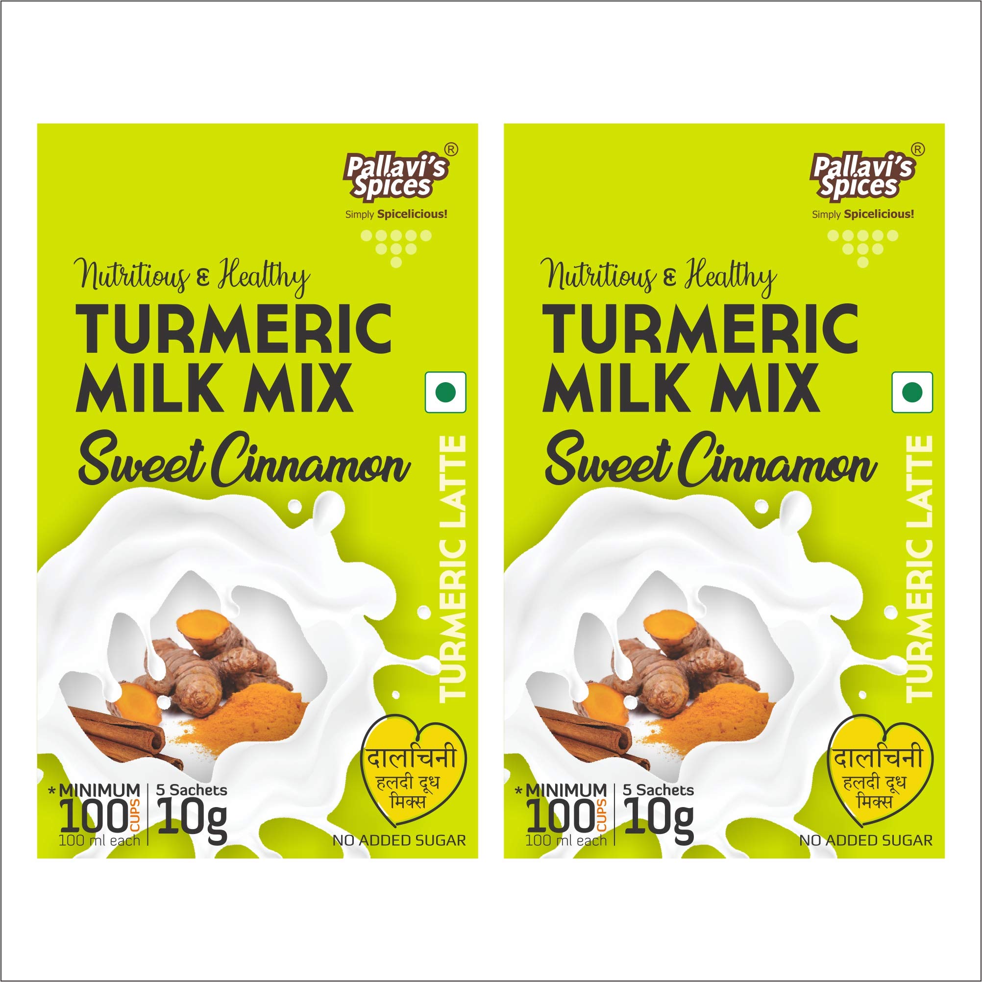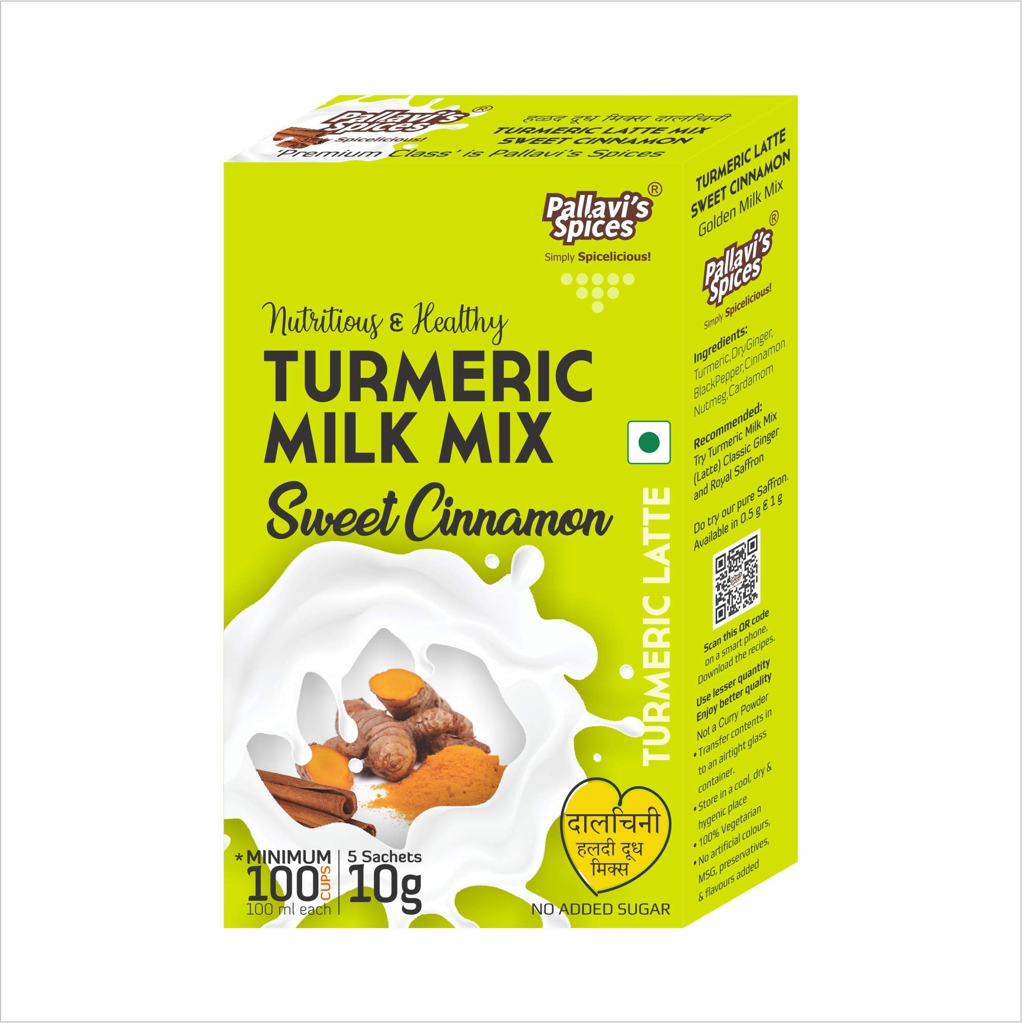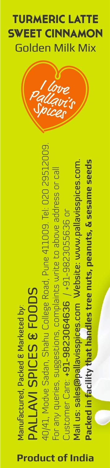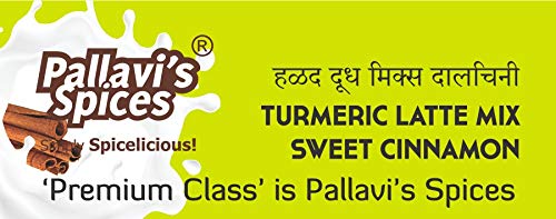 Turmeric Milk Mix Sweet Cinnamon of Pallavi's Spices is made of Turmeric powder Cinnamon Ginger and select spices. To be added in hot milk. No added Sugar. Can add Sugar Jaggery Powder or Honey later. Use lesser quantity enjoy better quality. No added preservatives artificial flavours and msg.