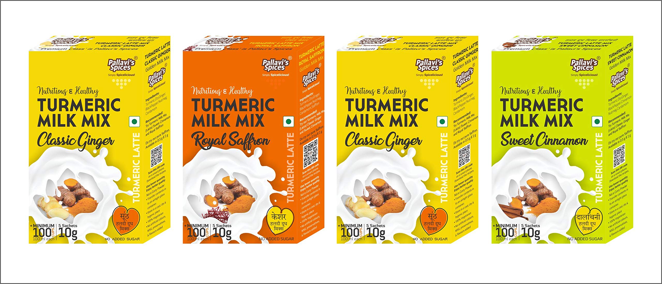 Pallavi's Spices Turmeric Milk Mix Combo has 2 Classic Ginger I Royal Saffron and 1 Sweet Cinnamon pack of 50g. One 50g pack each contains 5 sachets of 10g. One sachet is good for 20 cups of 100 ml milk. Quantity can differ according to taste. Popularly known as Haldi-Dudh (Turmeric Latte in West) this is a traditional Indian mix of turmeric Saffron/Ginger/Cinnamon & select spices added in hot milk offering many health benefits. Golden Milk (hot or cold) is a Supergood Daily Dose to your entire family and doesn't contain Sugar. Haldi-Dudh will be useful to overcome the stress in day to day life and boost your immunity. You may add sugar/jaggery/honey to your taste. Turmeric is well known for its anti oxidant and anti inflammatory properties. Add 1tbsp ‘Desi Ghee’ in the hot milk (optional). Stir well & serve. Note: Jaggery/honey is not added while boiling the milk. Add it later before serving.