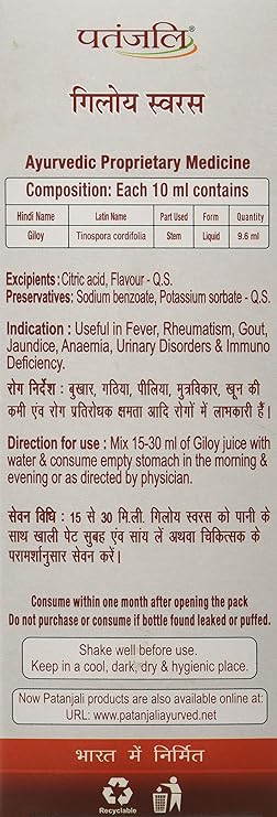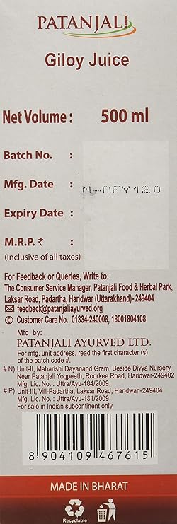 Giloy juice 500ml (Pack Of 2) an ayurvedic proprietary medicine composition: Each 10ml contains giloy that is tinospora cordifolia 9.6ml. Indication: Direction for use: Mix 15 to 30ml of giloy juice with water and consume empty stomach in the morning and evening or as directed by physician.