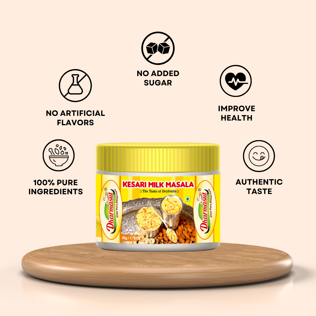 Dharmasut milk masala powder is well famous and rich in ingredients. Premium Kesari Milk Masala is made of High Quality and Purest dry fruits it includes small pieces of Badam Cashew Nuts Pista Mace Cardamom Synthetic Food Nutmeg and Saffron. Kesar Milk masala will give you the most astonishing taste and make you crave for milk every time. Milk masala powder is flavoured with kesar. The addition of milk masala powder with kesar doesn’t just make the milk taste a lot yummier but it also comes with a lot of health benefits which is great for your memory treats insomnia and softens the skin by regular consumption of this powder. Generally children do not like milk but adding our dudh masala powder will always make them crave for tastier milk. You can also use kesar badam milk masala powder while making Rabdi Kheer Barfi Halva Kesar Kulfi and other delicious sweets. Try our High Quality Milk Masala Powder once and make your sweets a lot delightful.