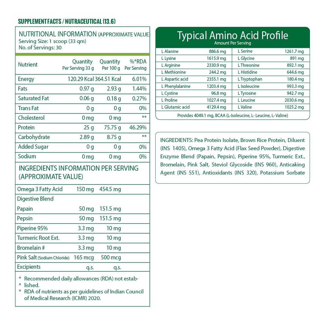 Pure Nutrition Vegan Protein is a complete plant-based protein powder that is easily digestible and utilized by our cellular system. It is rich in nutrients & dietary fibers. This vegan protein powder for men and women is high in Branched Chain Amino Acids (BCAA) and has all Essential Amino Acids (EAA) Omega 3 fatty acids and enzymes. It is made from pea protein isolate brown rice protein and 110 mg of multi-enzyme for easy absorption and . One scoop equone serving that provides 25 gm of high-quality protein with a diverse amino acid profile (essential and non-essential). This protein supplement provides 4 gm of BCAA that help promote lean muscle mass. It is enriched with flaxseed powder to improve your omega-3 fatty acids intake which helps and promote overall health. Pure Nutrition Vegan Protein is -free and contains no ed sugar. This chocolate vegan protein powder packs a delicious taste and gives satiety. "