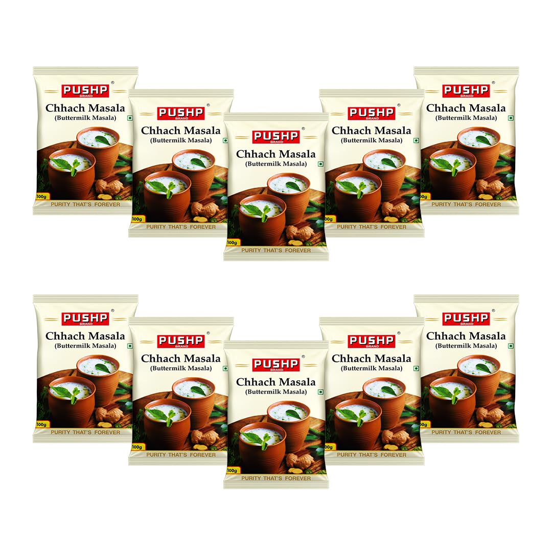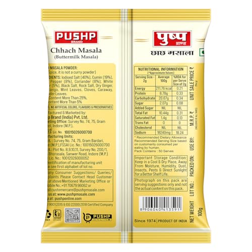 Elevate your everyday buttermilk into a flavorful and refreshing experience with Pushp Chhach Masala. Crafted with a time-tested recipe perfected over 50 years this traditional spice blend adds a burst of authentic Indian flavor to every glass. Made with high-quality natural ingredients Pushp Chhach Masala delivers a perfectly balanced mix of tangy spicy and savory notes that enhance the taste and digestive benefits of your chhach (buttermilk). Whether you're serving it at home in restaurants or during festive occasions this masala is a must-have to impress with its unique taste and aroma. Simply sprinkle it over a chilled glass of buttermilk stir and enjoy a refreshing drink that's both cooling and full of flavor. Packed in a convenient easy-to-store pouch this masala maintains its freshness and aroma over time. Pushp Masale a trusted name in Indian kitchens for decades ensures purity quality and authentic regional flavor in every pinch.