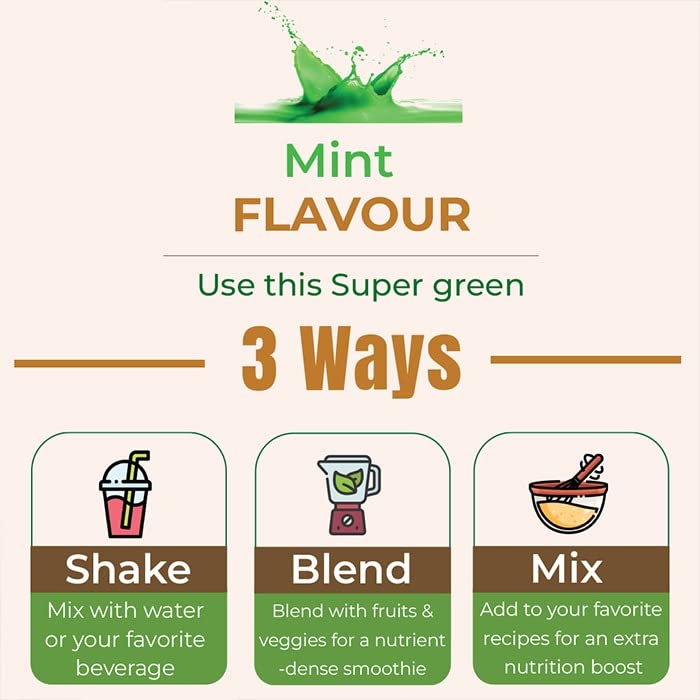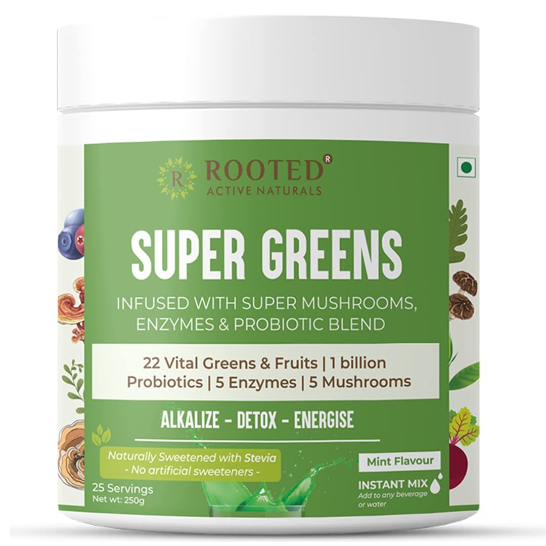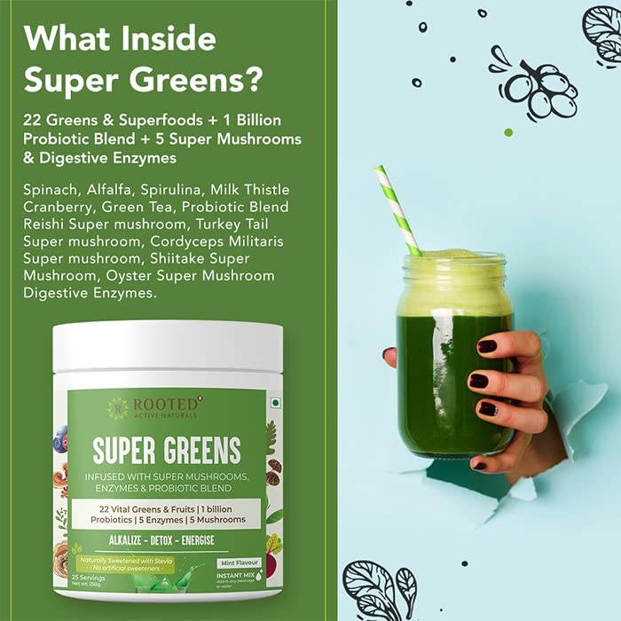 Rooted Actives Super Greens (250 g) 22 essential greens super mushrooms herbs and probiotics (No Added Sugar) | | Heart Circulation health Energy⦠(Mint Flavour)