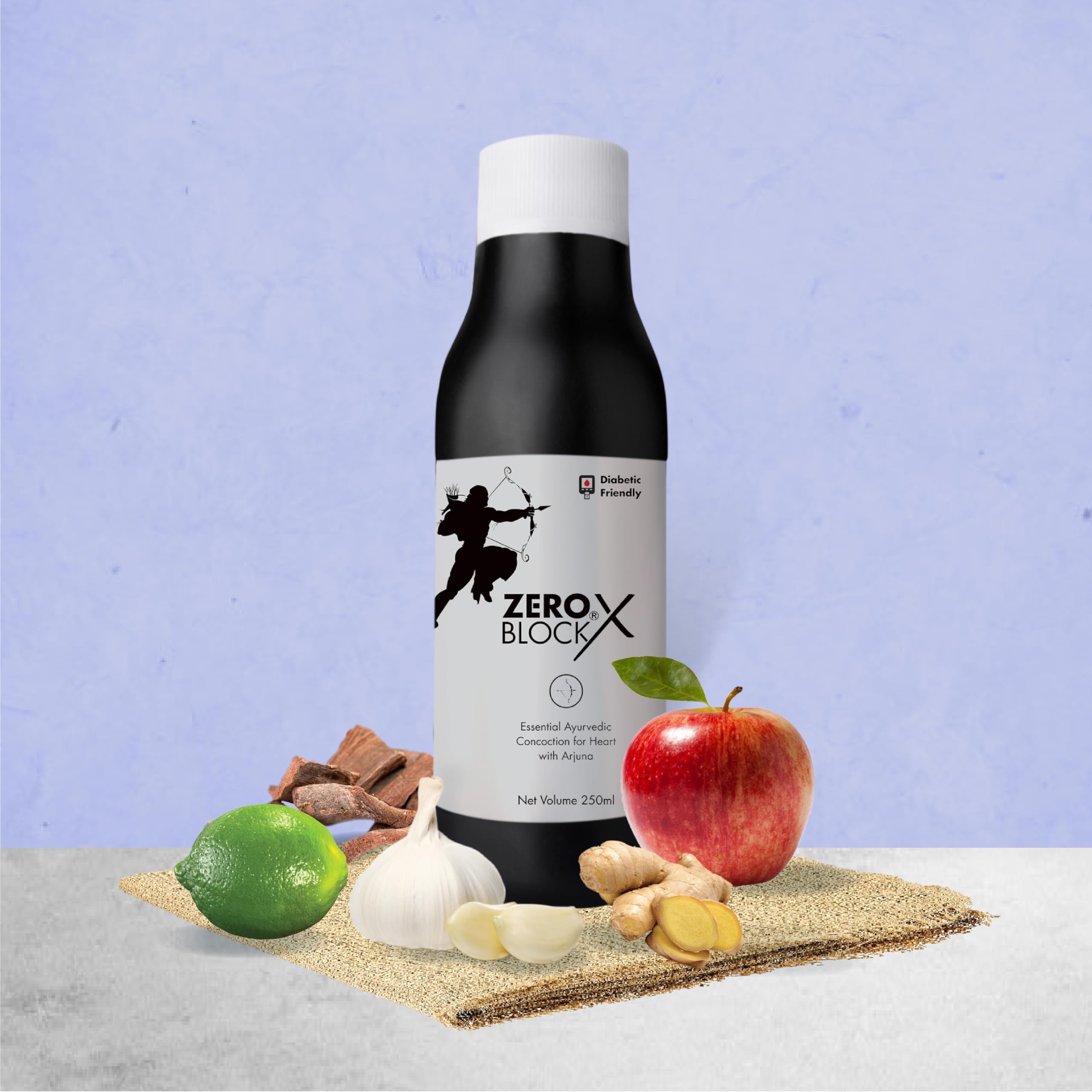 ZERO BLOCK X is an ayurvedic concoction that can help in maintaining heart health. It is a unique blend of natural ingredients like Apple cider vinegar Garlic extracts Ginger extracts Lemon Extracts and Arjuna. ZERO BLOCK X is a diabetic-friendly combination for heart wellness which is to be taken 15ml every morning empty stomach. It is not only an essential heat-tonic for those who have already gone through surgeries or procedures but also it a harmless preventive measure for every age group to stay healthy active and heart-strong amidst the modern-day problems. The juice of handpicked garlics has allicin that reacts with red blood cells and produces hydrogen sulphide which is helpful in maintaining the fluidity of blood and boosting good cholesterol. Lemon helps in slowing down the progression of atherosclerosis which is the hardening of arteries. Apple cider vinegar helps in lowering cholesterol and triglyceride levels and ginger has enriching properties and can relax blood vessels. Zero Block X is a diabetic friendly heart drink that contains the herb arjuna which can boost overall health and well-being. Arjuna is an ayurvedic ingredient that can help boost heart functions and strengthen the muscles of the heart. The herb possesses strong anti-inflammatory and antioxidant properties that can protect the heart muscles and blood vessels against damage caused by free radicals.
